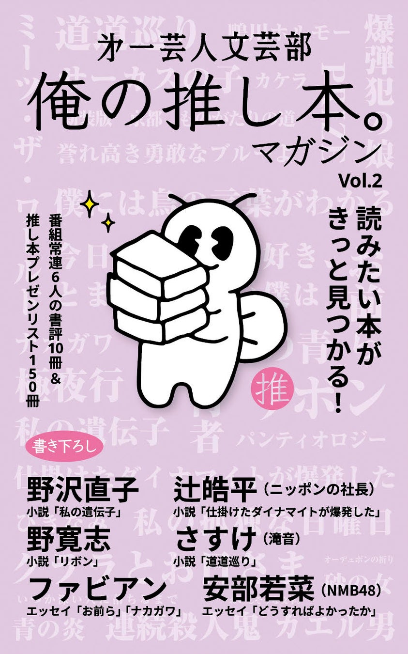 「第一芸人文芸部 俺の推し本。」は、又吉直樹が文学好きの芸人を集めて活動する「第一芸人文芸部」の冠番組。出演者それぞれが人に薦めたい「推し本」を持ち寄り、舞台で鍛え上げた話芸でプレゼンしあうブックバラエティです。冊子には、第一芸人文芸部の創設メンバーで番組のMCを務めるピストジャム、ファビアンに加え、番組の常連メンバーである 野沢直子、ニッポンの社長・辻、滝音・さすけ、NMB48・安部若菜が、それぞれ書評のほか、小説やエッセイを書き下ろしました。