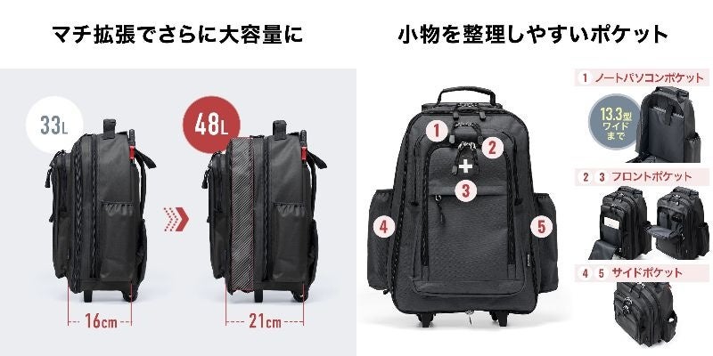 リュック時は、キャスターカバー付きで、ショルダーベルトはクッション入りでベルト長も調整が可能です。メイン収納部は、ダブルジップ式でガバっと開いて使いやすく、容量も33L~48L(マチ拡張時)に対応します。