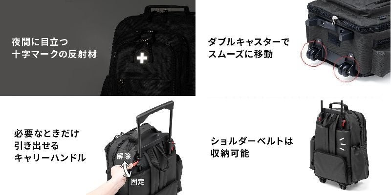 キャリーバッグ使用時は、ダブルキャスター仕様、キャリーバーは無段階で調節可能、ショルダーベルトも収納可能です。リュックとして使用する際は、両手が自由に使えるようになります。