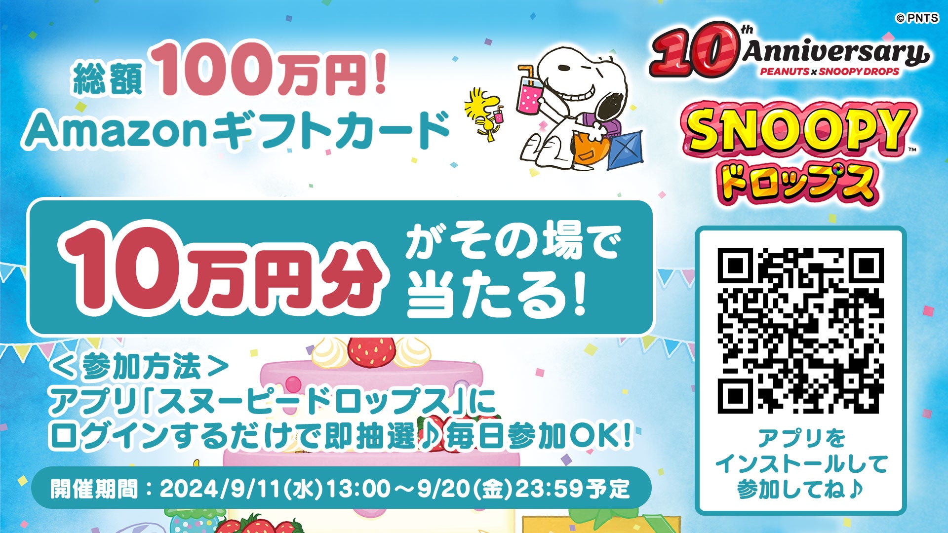 <祝!10周年>アプリ『スヌーピードロップス』総額100万円分の豪華景品が当たる「びっくり仰天(10)!豪華な10周年キャンペーン」を開催♪