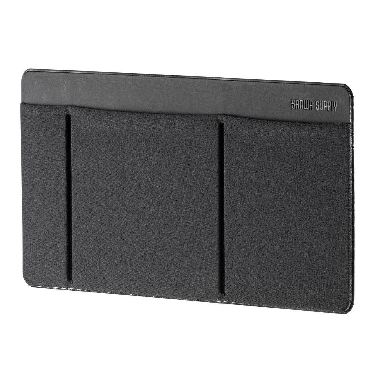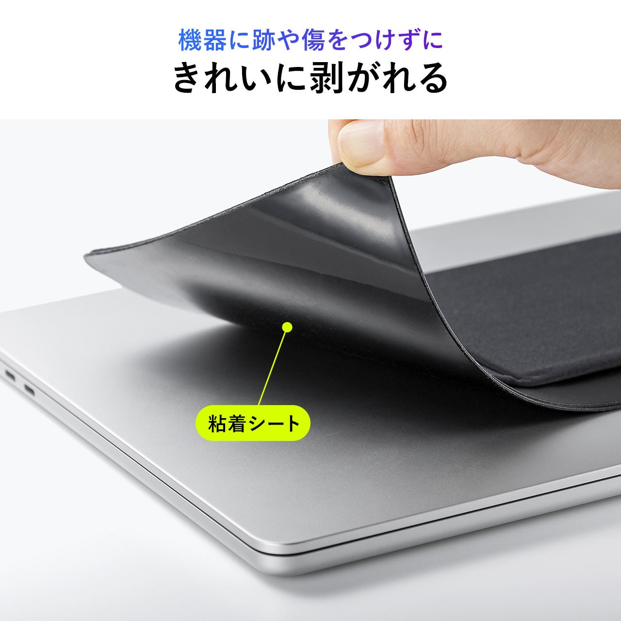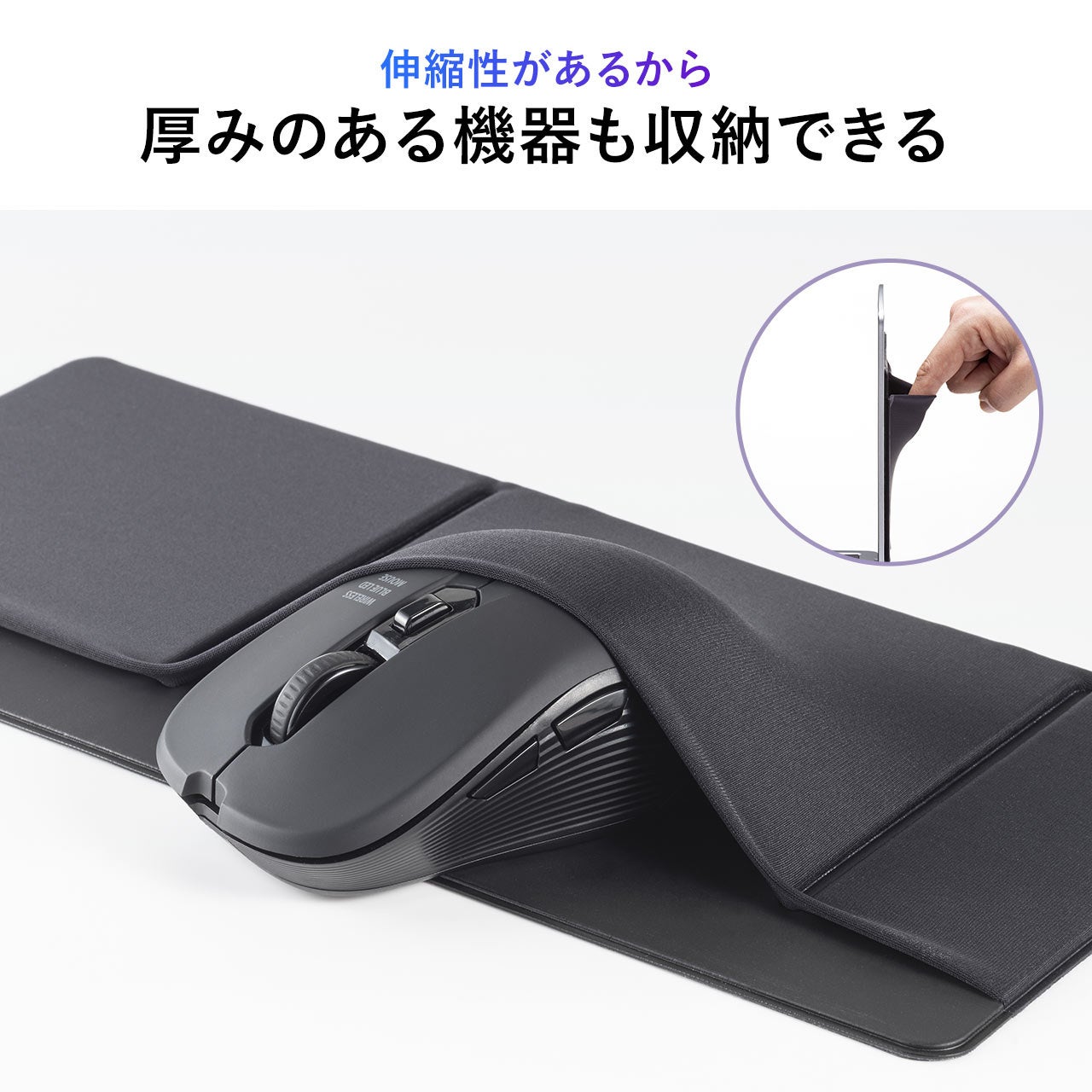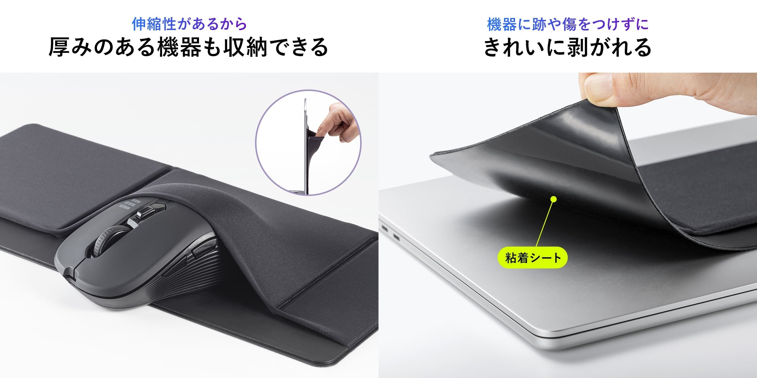 伸縮性のある素材で伸び縮みし、厚さのある機器も収納できます。再剥離可能な粘着シートを採用しています。