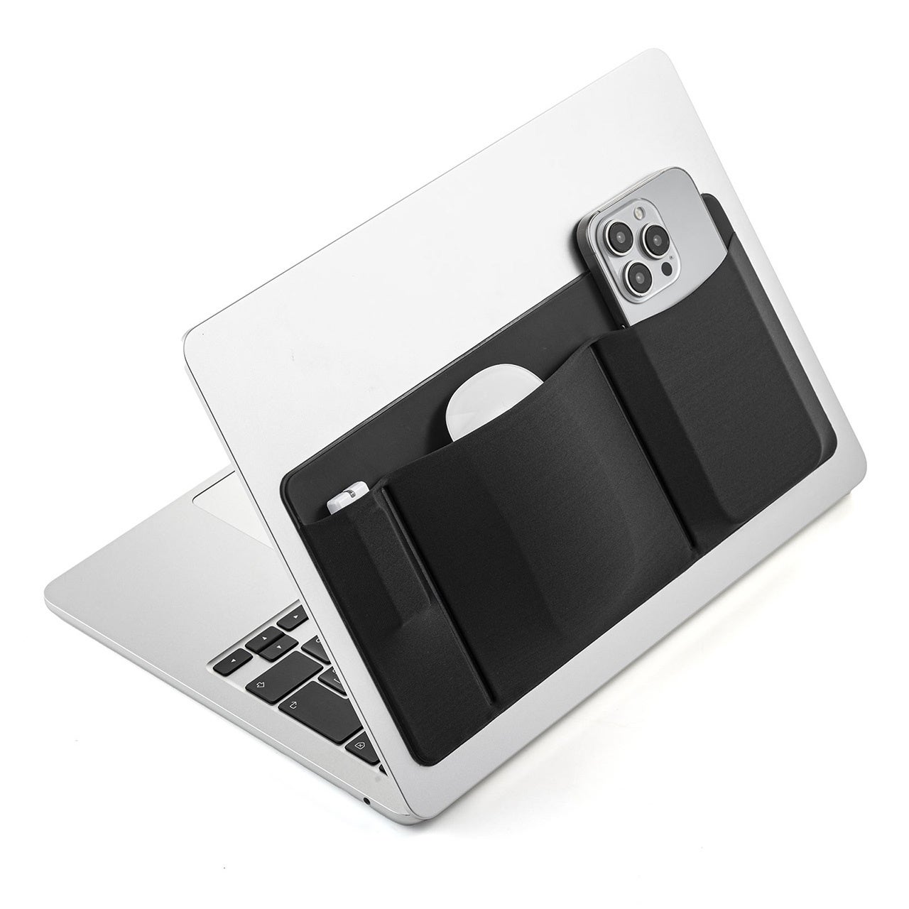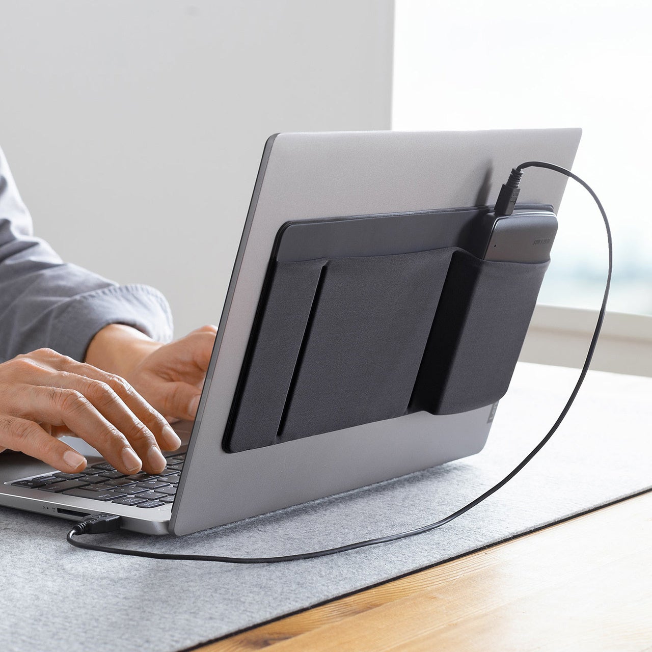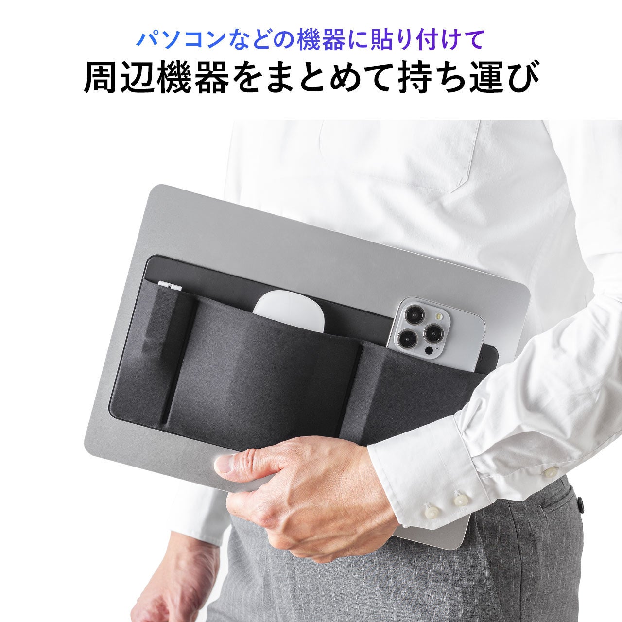 本製品は、ノートパソコンの背面に後付けで貼り付けできる周辺機器用のポケットです。