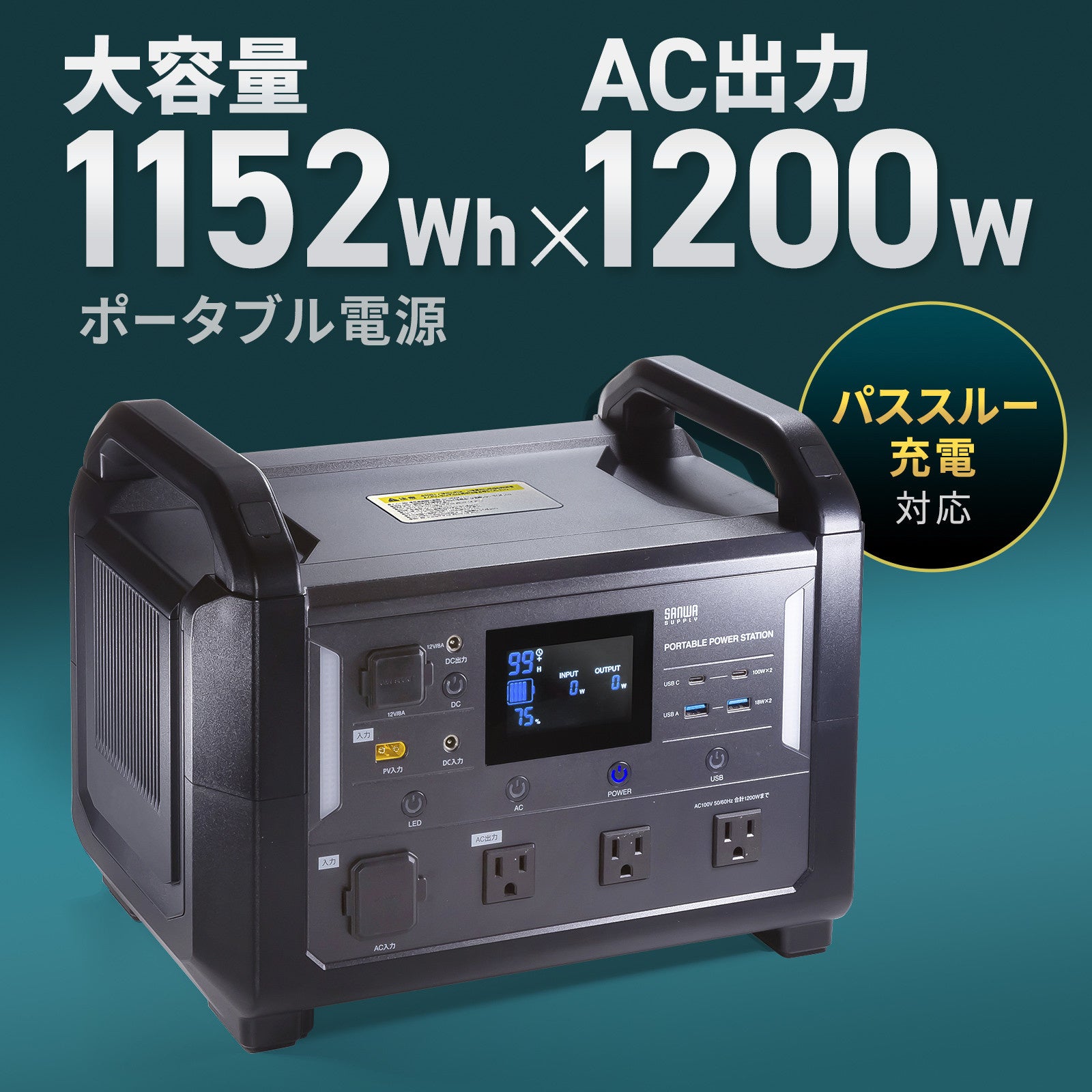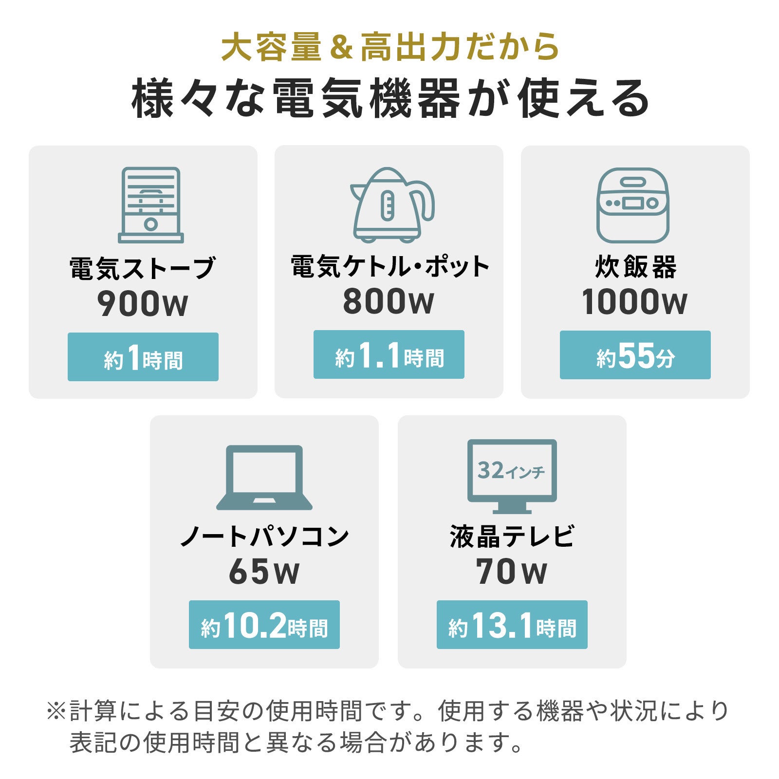 1200WまでAC出力が可能な高出力タイプのバッテリーです。コンセントのない場所でも、パソコンやディスプレイ、電気ストーブなど様々な高出力機器を使用できます。