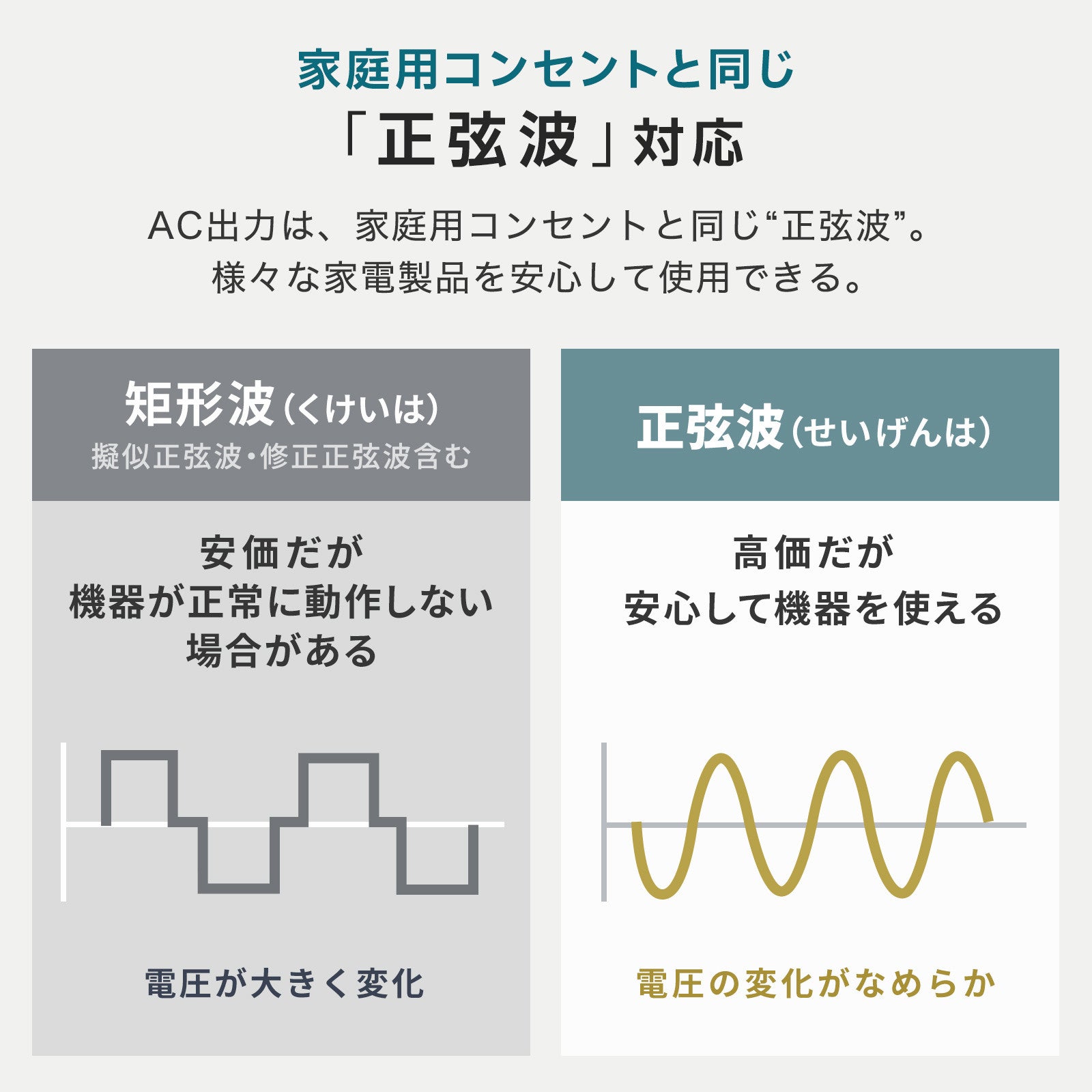 AC出力は家庭用コンセントと同じ「正弦波」です。様々な家電製品を安心して使用できます。