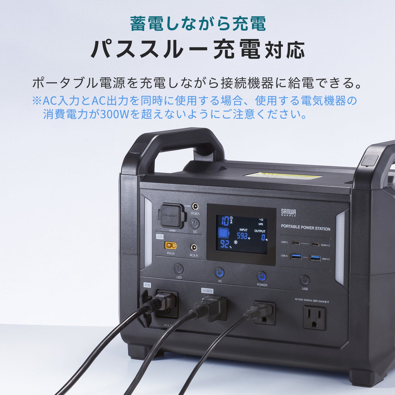 ポータブル電源を充電しながら接続機器に給電できます。 ポータブル電源のバッテリー残量が少なくても、充電と同時に接続機器の給電ができます。