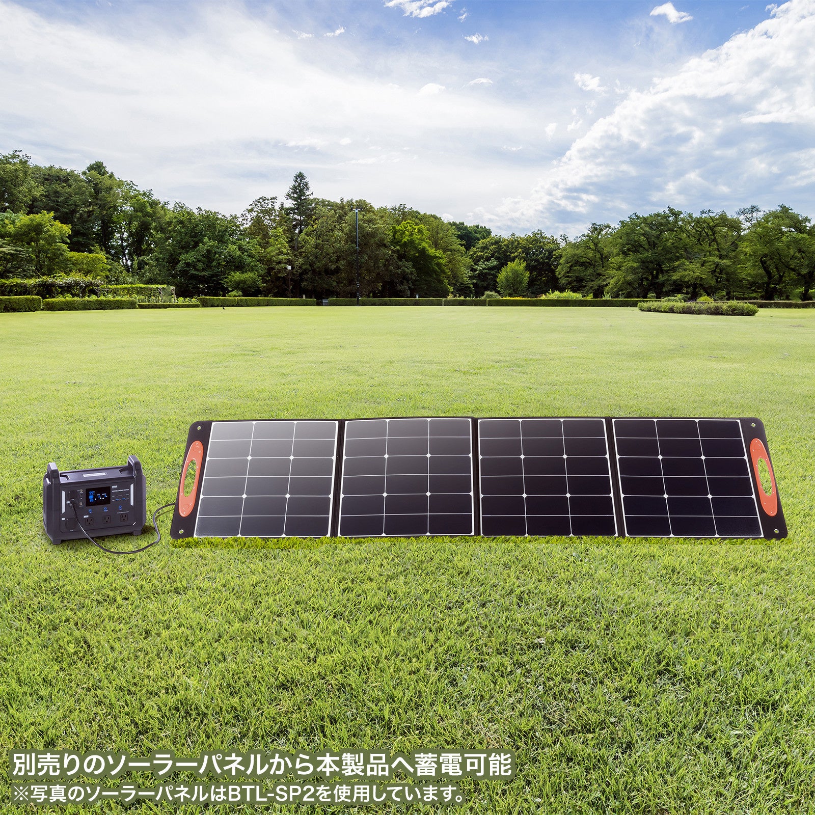 また、付属のMC4コネクタ充電ケーブルを使えば、別売りのサンワサプライ製ソーラーパネル「BTL-SP1」「BTL-SP2」や市販品を接続して蓄電もできます。「MPPT(最大電力点追従制御)」機能を搭載しており、最大の電力を取り出して効率的に蓄電できます。