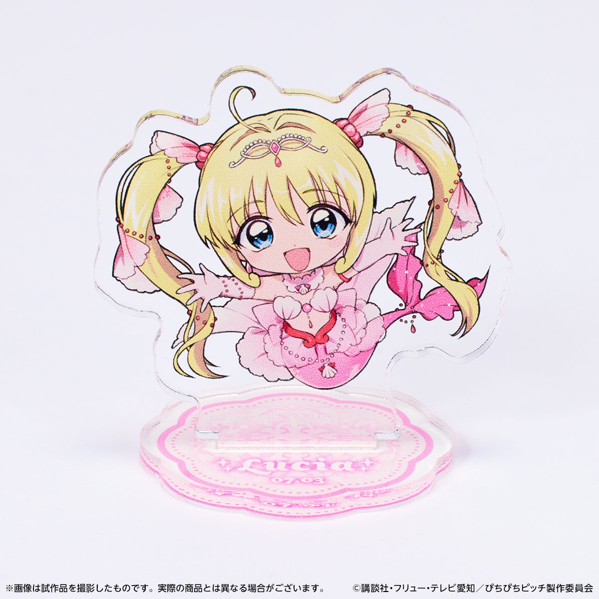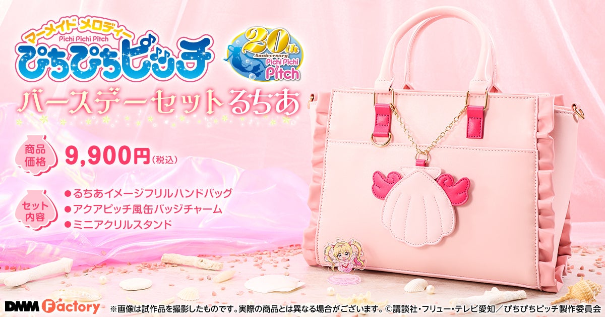 放送20周年を迎えたテレビアニメ『ぴちぴちピッチ』のマーメイドプリンセスたちを祝うバースデーセット第2弾は、「るちあ」をイメージしたフリルハンドバッグ、アクアピッチをイメージした缶バッジチャーム、ミニキャライラストを使用したアクリルスタンドのセット。