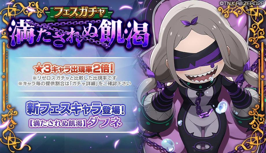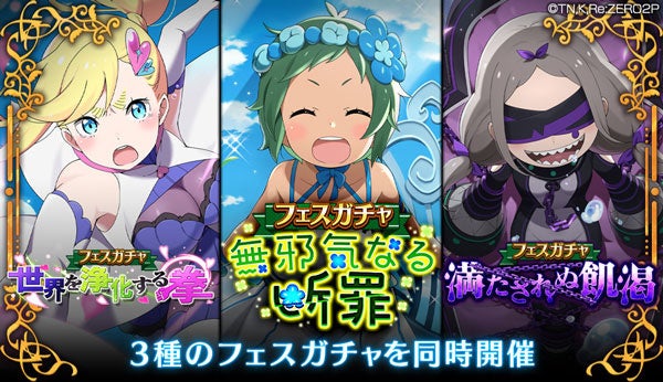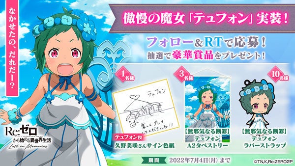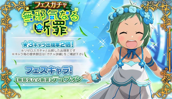 株式会社セガは、配信中の人気テレビアニメ「Re:ゼロから始める異世界生活」公式スマートフォン向けゲーム『Re:ゼロから始める異世界生活 Lost in Memories(以下、『リゼロス』)』にて、本日より強力なフィールド効果を発動するスキル4を所持した[フェスキャラ]「【無邪気なる断罪】テュフォン★3」が初登場する「フェスガチャ【無邪気なる断罪】」、「傲慢の魔女」テュフォンがボスとして登場する限定クエスト「テュフォンからの挑戦状」を開催します。