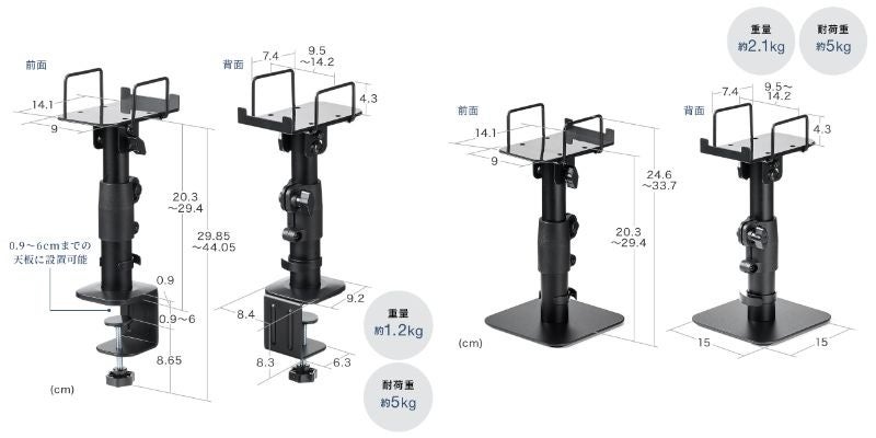 製品のサイズは、100-SPSTN03が約W9~14.2×D14.1×H25~33.5cmで、重量が約1.2kg、100-SPTN04は約W9~14.2×D14.1×H25~34.5cmで、重量は約2.1kgです。いずれも耐荷重は5kgです。