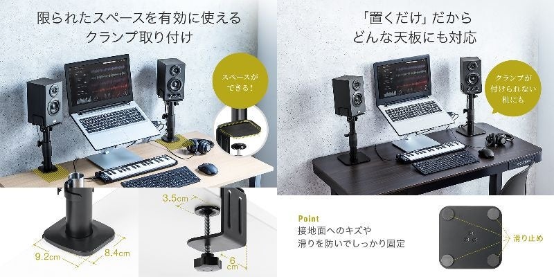 スピーカーを浮かせて設置できる、スタンドタイプとクランプ取り付けタイプ2種類のスピーカースタンドを2月8日に発売