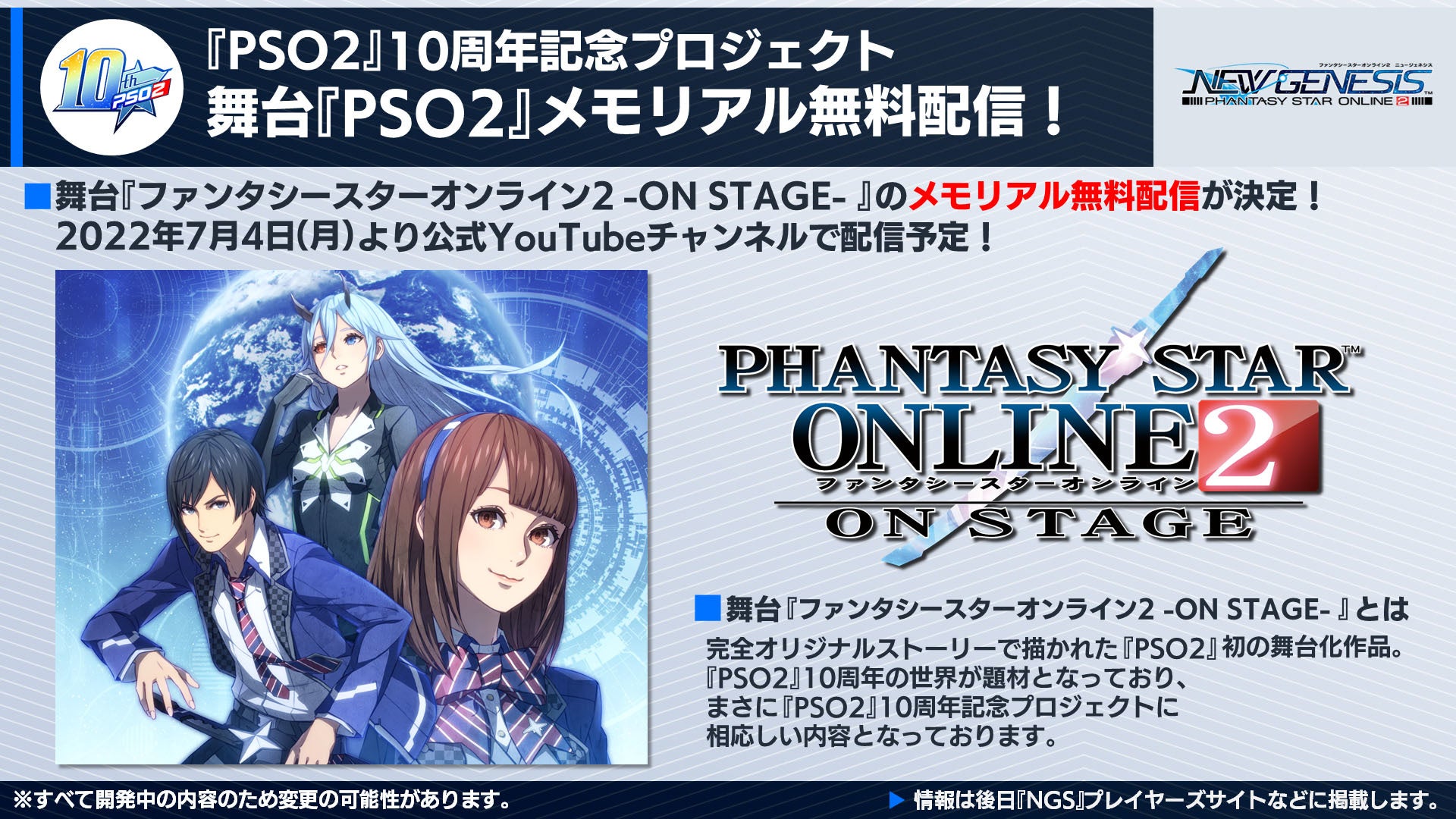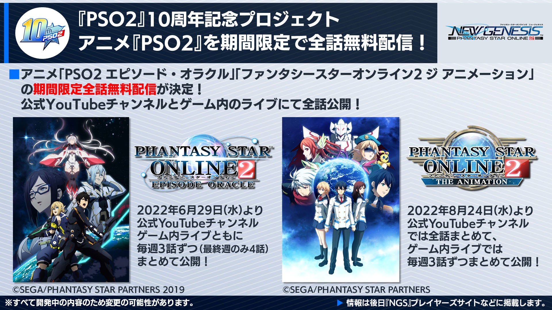 また、『PSO2』の10周年を記念して、アニメ『PSO2 エピソード・オラクル』と『ファンタシースターオンライン2 ジ アニメーション』の2作品、2014年に公演された、舞台『ファンタシースターオンライン2 -ON STAGE-』の映像版を期間限定で無料配信します。