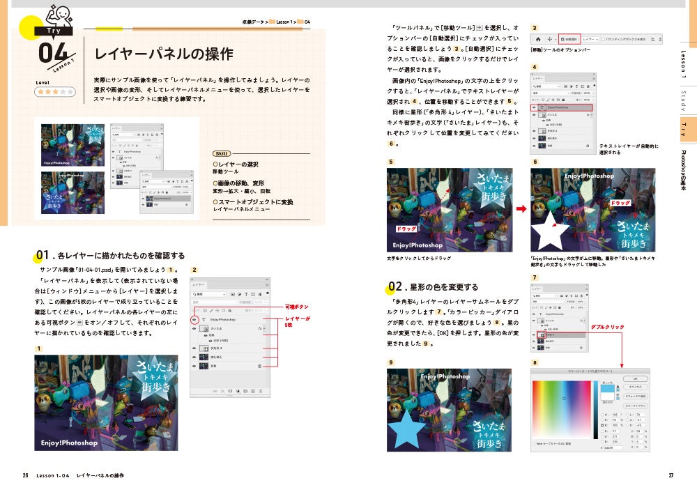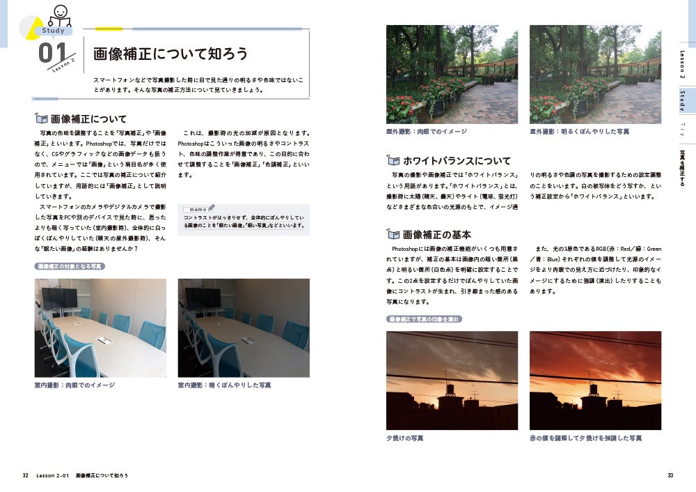 本書は章ごとに、「基本知識を学ぶ Study → 作例をつくってみる Try」の構成になっており、操作の基本をしっかり理解したうえでPhotoshopを使えるようになります。