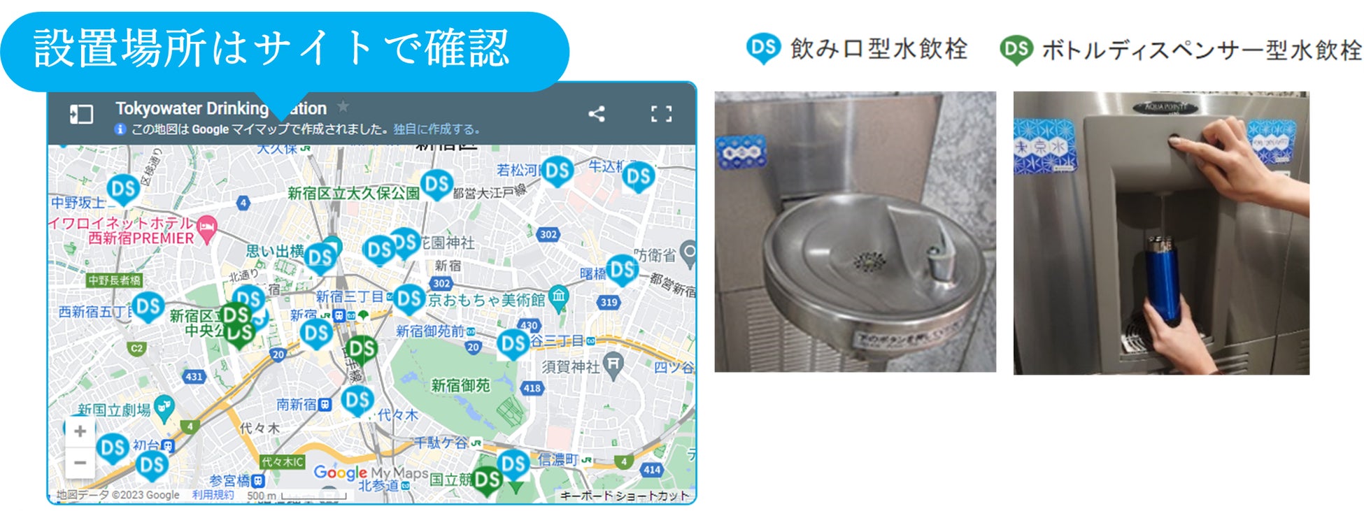 また、冷たい東京水が飲める給水スポット「Tokyowater Drinking Station」を東京都のサイトでご紹介しています。「Tokyowater Drinking Station」は都内公共施設等を中心に約900か所あり、高品質な東京の水道水を実感していただくとともに、マイボトルの利用による環境配慮行動の促進も目的としています。