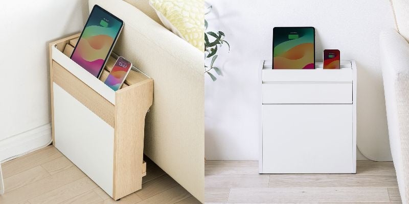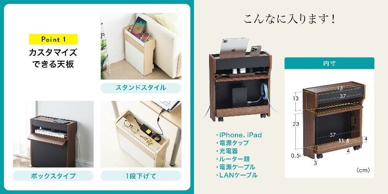 天板を段違いにすれば、タブレット、スマートフォンスタンドとしても使用できます。ケーブルを底面に引っ掛けられる溝付きでケーブルを通し、引っ掛けての設置が可能です。大きめの無線ルーターなども収納が可能で、部屋をスッキリ美しくさせることはできます。内部にケーブルフックを装備し、余剰ケーブルをコンパクトにまとめることができます。