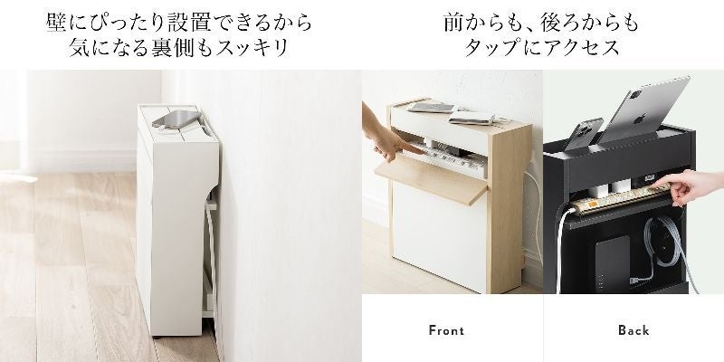 背面はケーブル等が棚板からこぼれ落ちないようにできる、ストッパー付きです。壁などにぴったり付けて設置できるスリット付きです。正面マグネット開閉式扉でタップのスイッチのON/OFFが簡単に行え、機器のメンテナンスや配線の組み替えも楽に行えます。上部からのホコリを防ぐことができます。