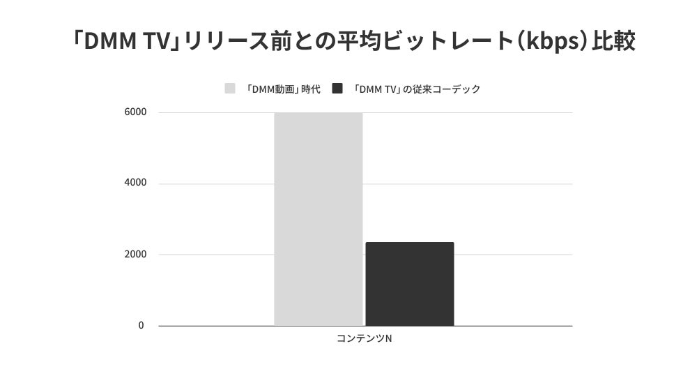 DMMにおいても、20年以上にわたり動画配信サービスを運営する中で、コンテンツの高圧縮化と高画質化にも取り組んでまいりました。2022年12月より提供している「DMM TV」においては、リリース当初よりコンテンツ種別による独自処理やシーン分析によるパラメータ調整など、様々な新しいアプローチによって高い圧縮率と高画質を両立し、「DMM TV」リリース以前に提供していた「DMM動画」と比較して1/3程度のデータ量で同等の画質を実現していました(図3)。