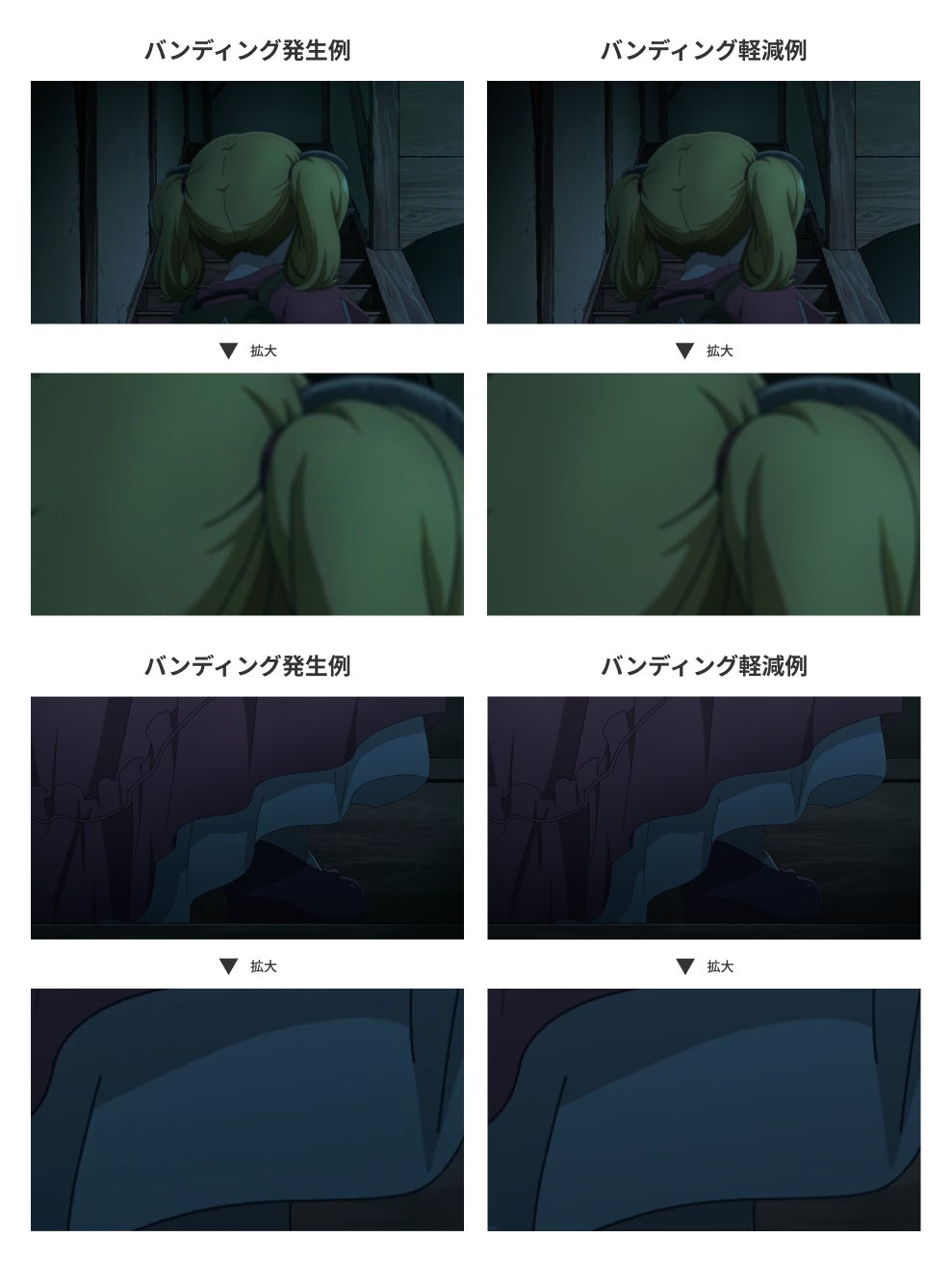 「DMM TV」では、バンディングを軽減させる様々なパラメータチューニングを行っており、特にアニメの画質向上に大きく寄与しています。
