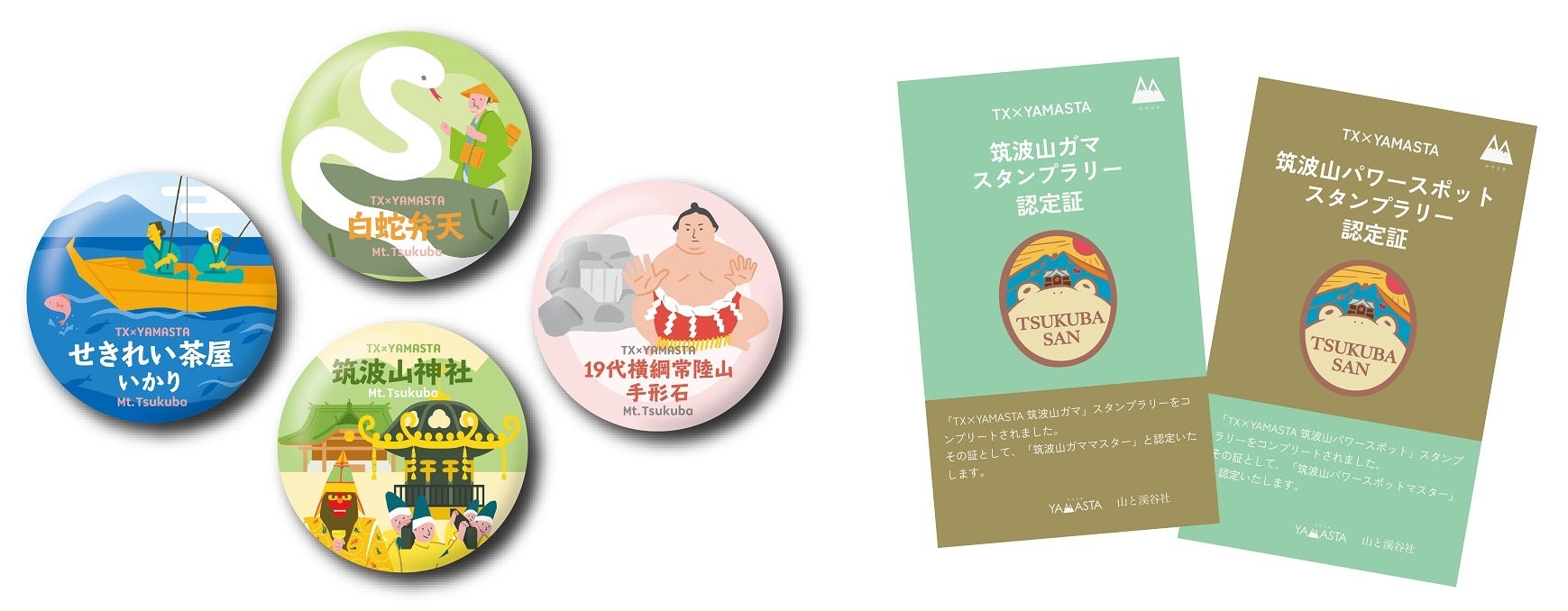 いずれかのコースを達成し、獲得したトロフィーまたはスタンプを筑波山観光案内所(営業時間:8時30分~17時15分)で提示すると、その場で缶バッジ(先着1,000個、デザイン全14種)と認定証(コース別、デザイン2種)をプレゼントいたします。