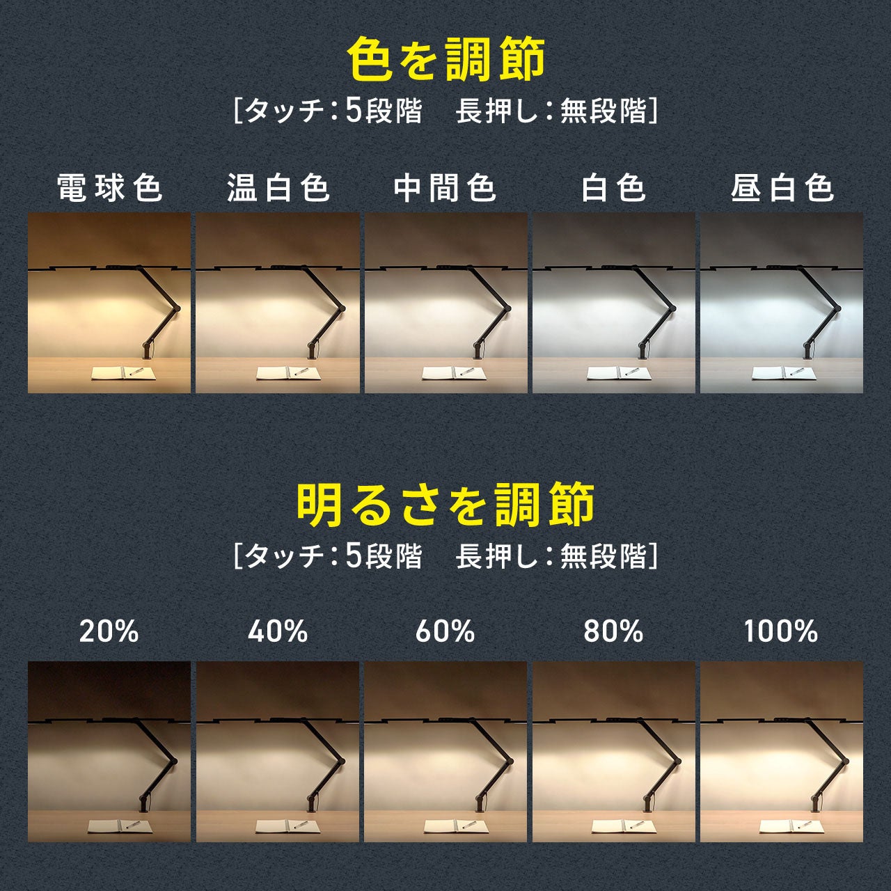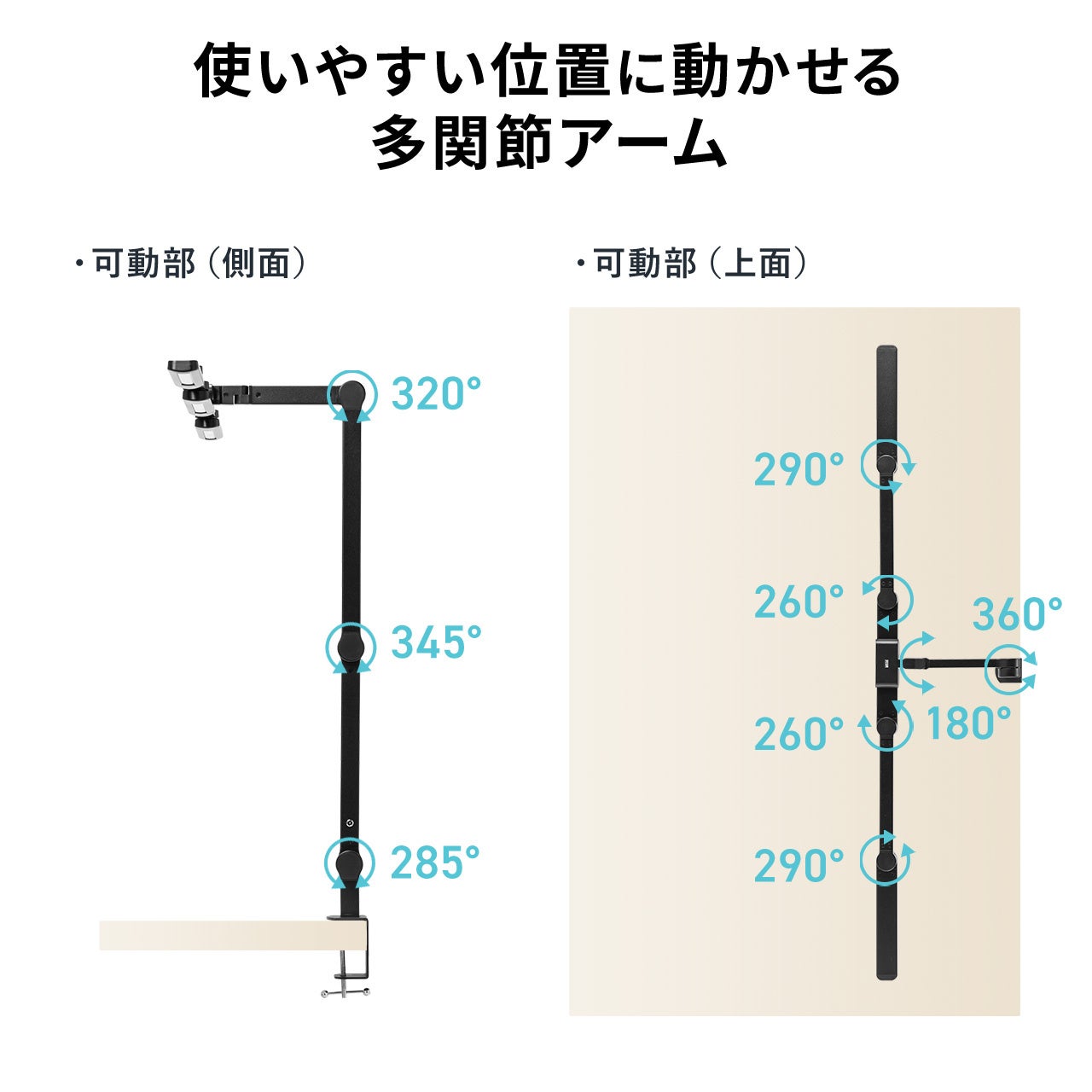 LED部は折りたためて180°方向調整ができ、アームとクランプ部は360°回転します。