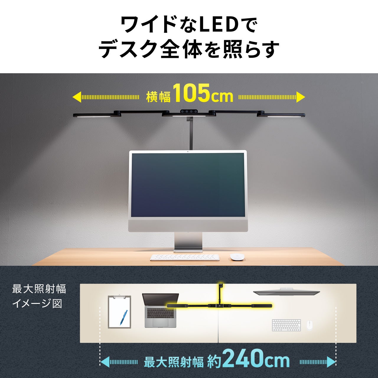 クランプで設置できる、デスクでの使用に最適なLEDライトです。全体幅約105cm、照明範囲は2.4mとワイドサイズでしっかりとデスクを照らします。