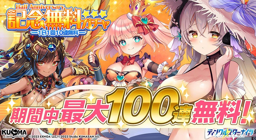 2024年1月7日でリリース半年を記念しまして、最大100連のガチャがひける「Half Anniversary記念無料ガチャ」を開催します!