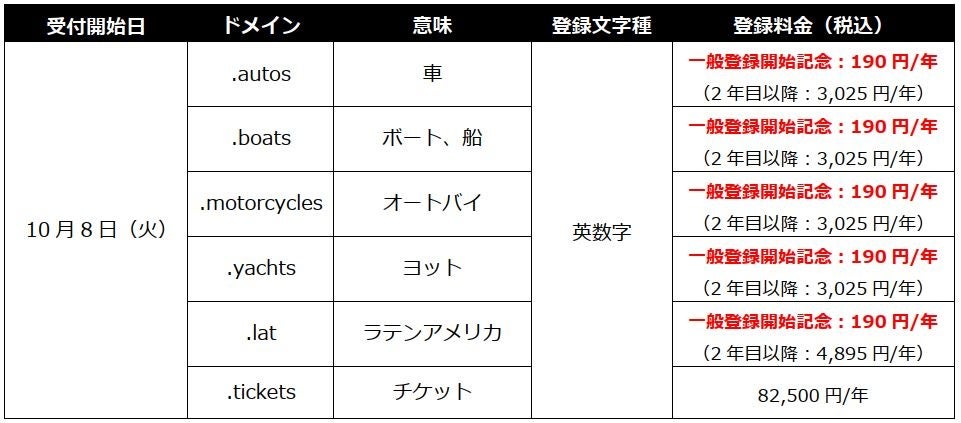 これを記念して、同日から2024年12月26日(木)までの期間、「.autos」「.boats」「.motorcycles」「.yachts」「.lat」を一般登録開始記念特別価格(※2)でご登録いただけるキャンペーンを実施いたします(初年度のみ)。