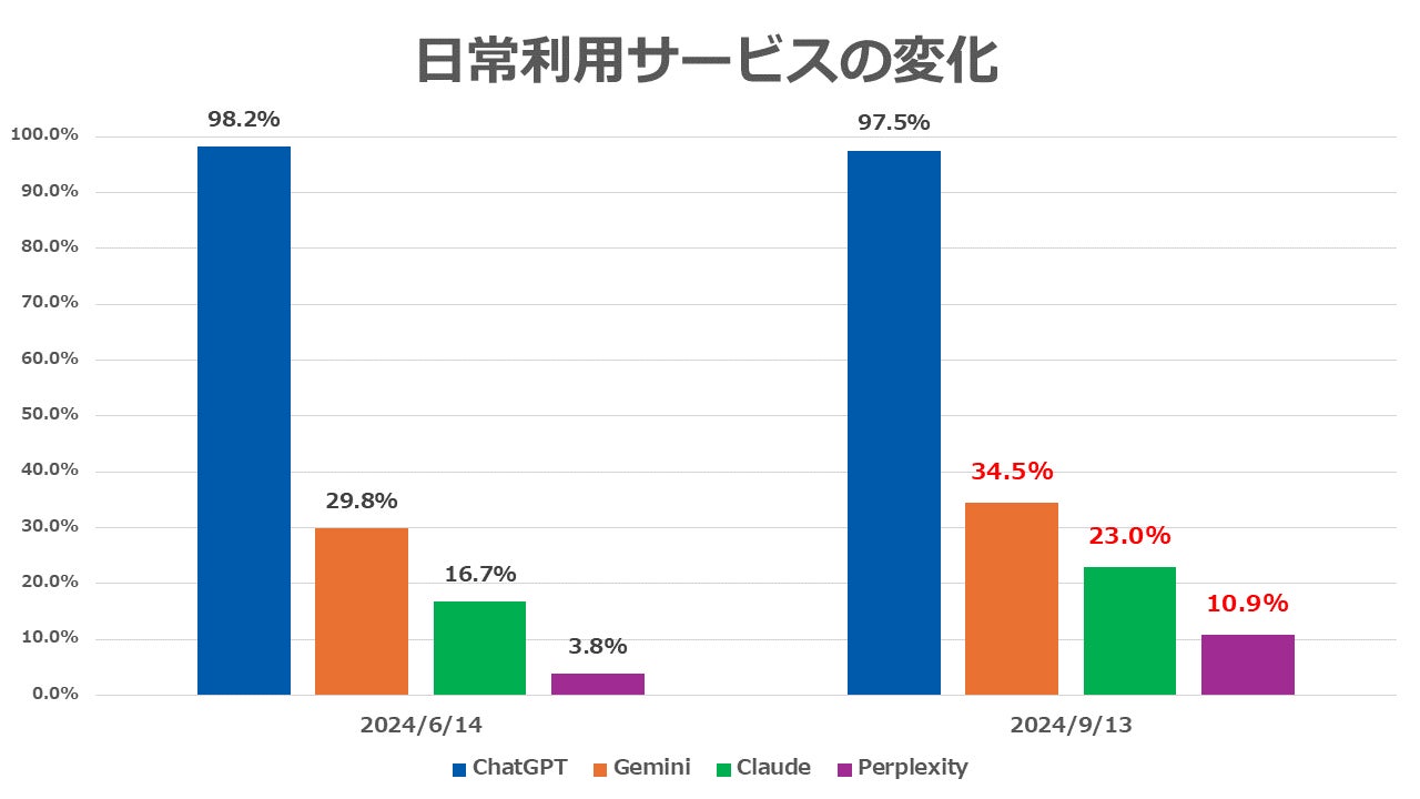 日常的に利用しているAIサービスのうち、Claude、Gemini、Perplexityが増加したこともわかりました。