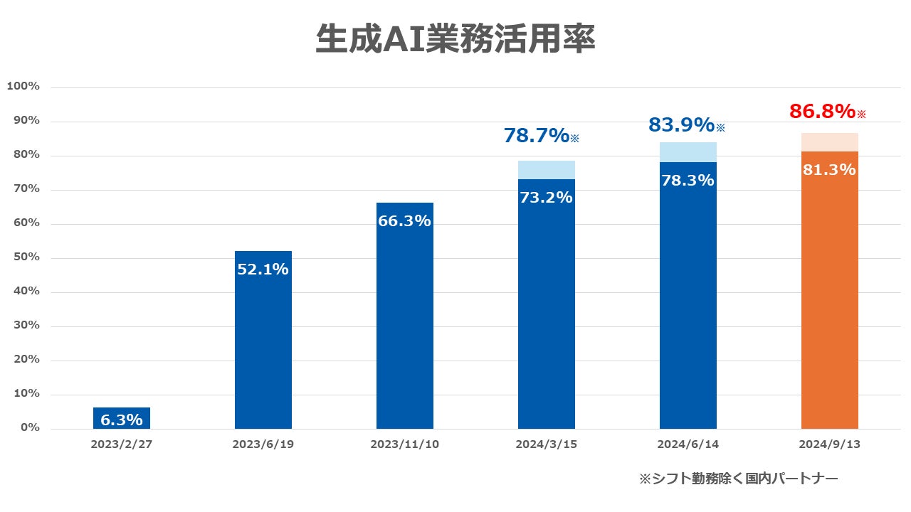 国内パートナー(シフト勤務除く)の86.8%が生成AIを活用(前回調査差+2.9ポイント)。
