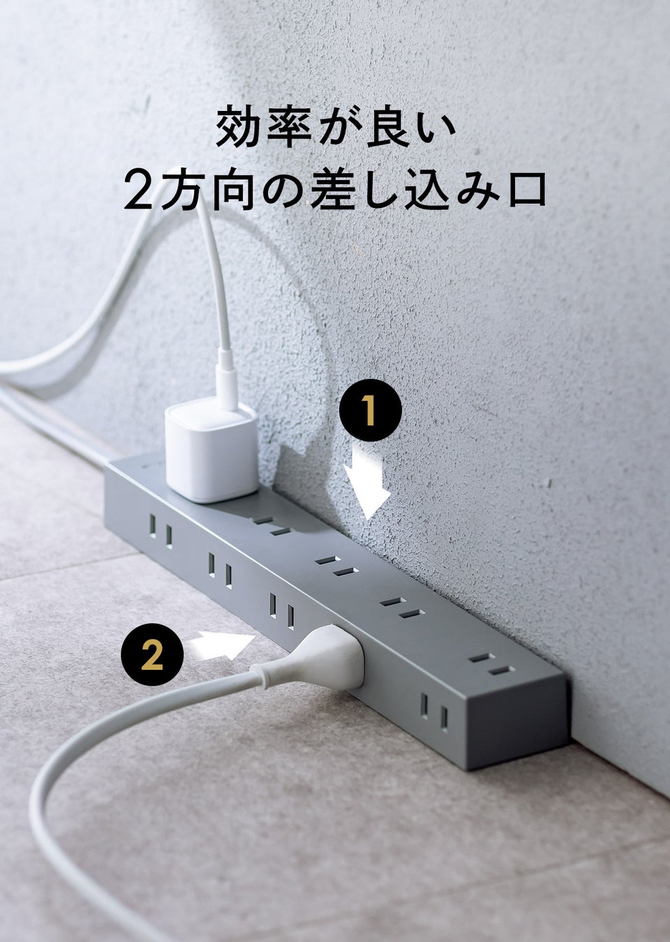 差込口の配置が正面と側面の2方向から電源プラグを差せるよう工夫されており、プラグ同士が干渉せずに効率よく差せます。狭いスペースでもすっきりとプラグを設置でき、配線の乱れも解消します。