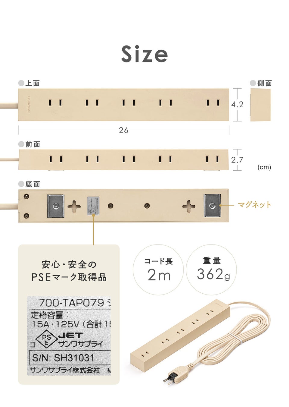 電源タップ マグネット付 10個口 ケーブル長2m 強力マグネット おしゃれ NATULLY(ナチュリー)