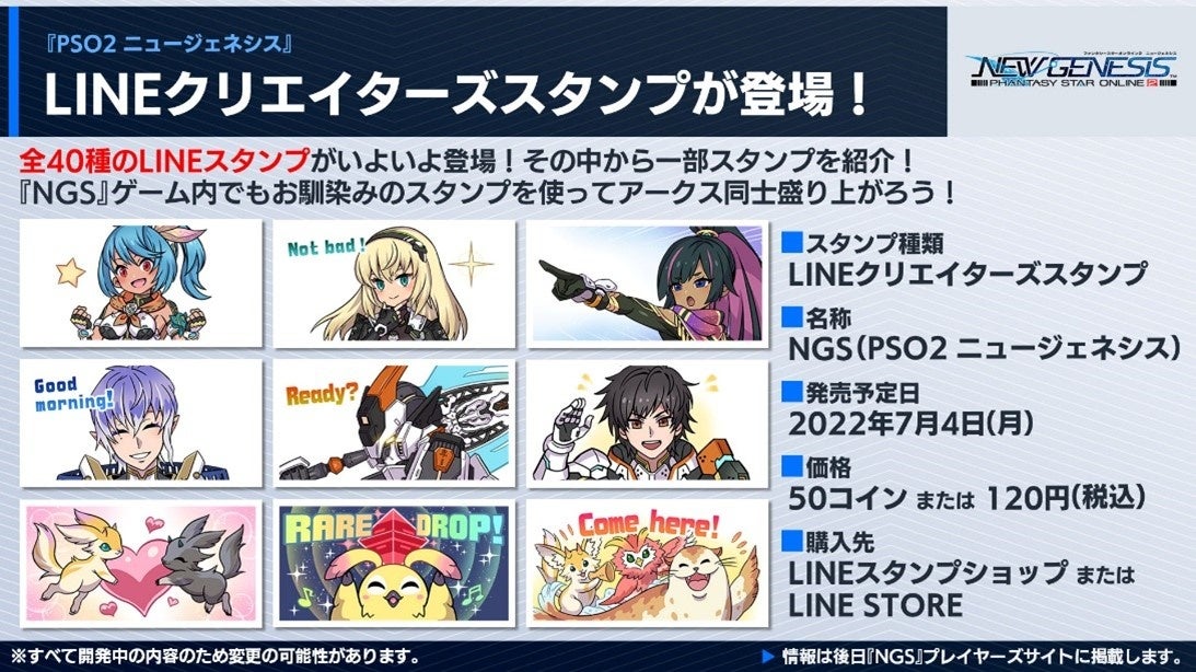 『PSO2』の10周年を記念して、全40種類がセットになったLINEスタンプが登場します。『NGS』ゲーム内でもおなじみのスタンプを使って、ぜひ仲間と盛り上がってください。
