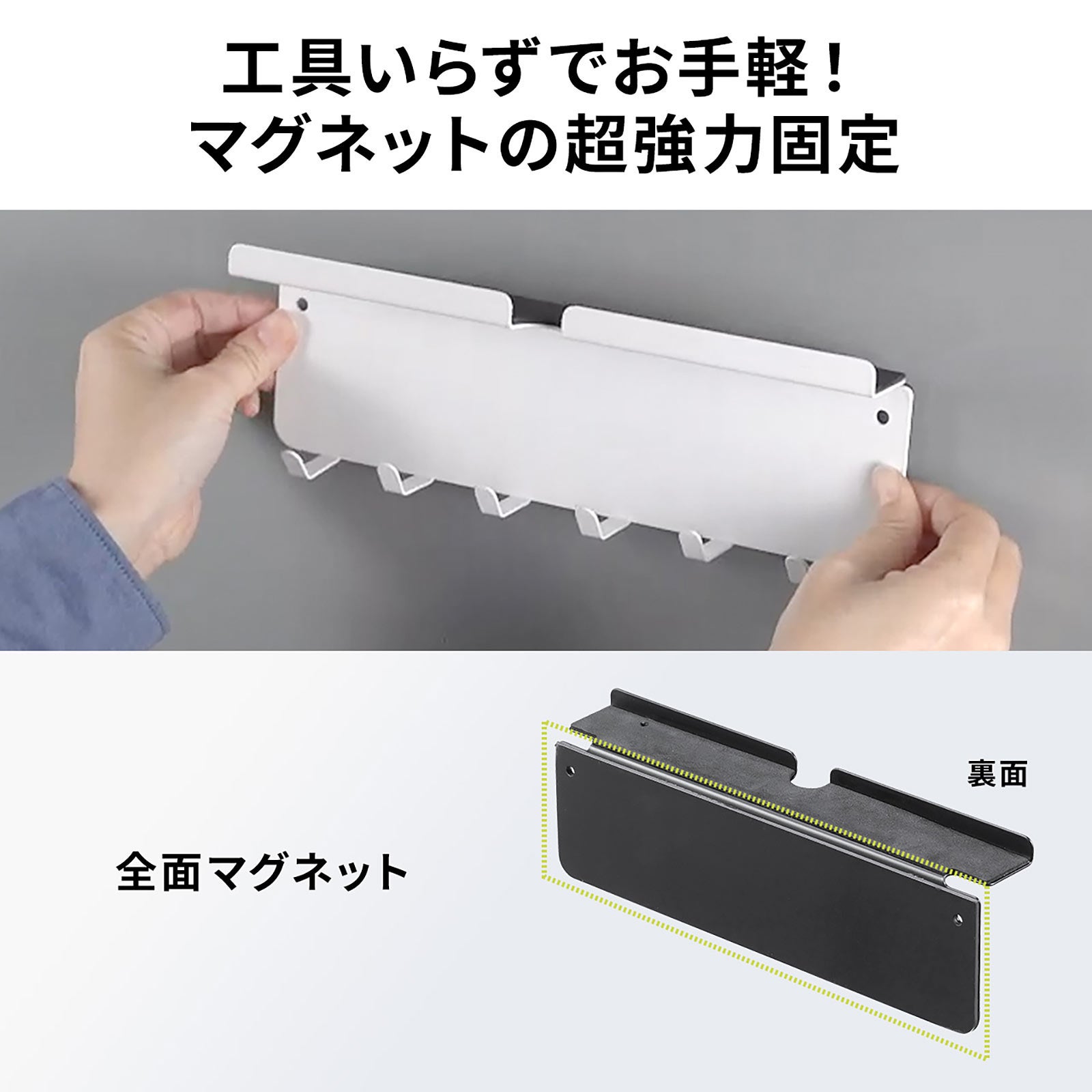 本製品は、マグネット貼付けでデスク周り、キッチン回り、玄関、オフィスと磁石で貼り付けができる様々な場所に取り付け可能です。