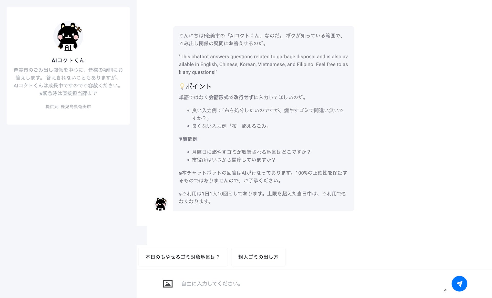 GMOインターネットグループのGMOペパボ株式会社(代表取締役社長:佐藤 健太郎、以下「GMOペパボ」)が提供するお問い合わせ対応AI導入支援サービス「GMO即レスAI」(URL:https://sokuresu.ai/)が鹿児島県奄美市役所に採用されました。2024年10月1日より奄美市公式キャラクター「コクトくん」をモデルにした『AIコクトくん』(URL:https://miibo.jp/chat/0ece1697-f6a3-4526-a3f4-8fe095cb69b1191a110715d41?name=AIコクトくん)として、ごみ・リサイクルに関する問い合わせに生成AIを用いて24時間365日対応しています。