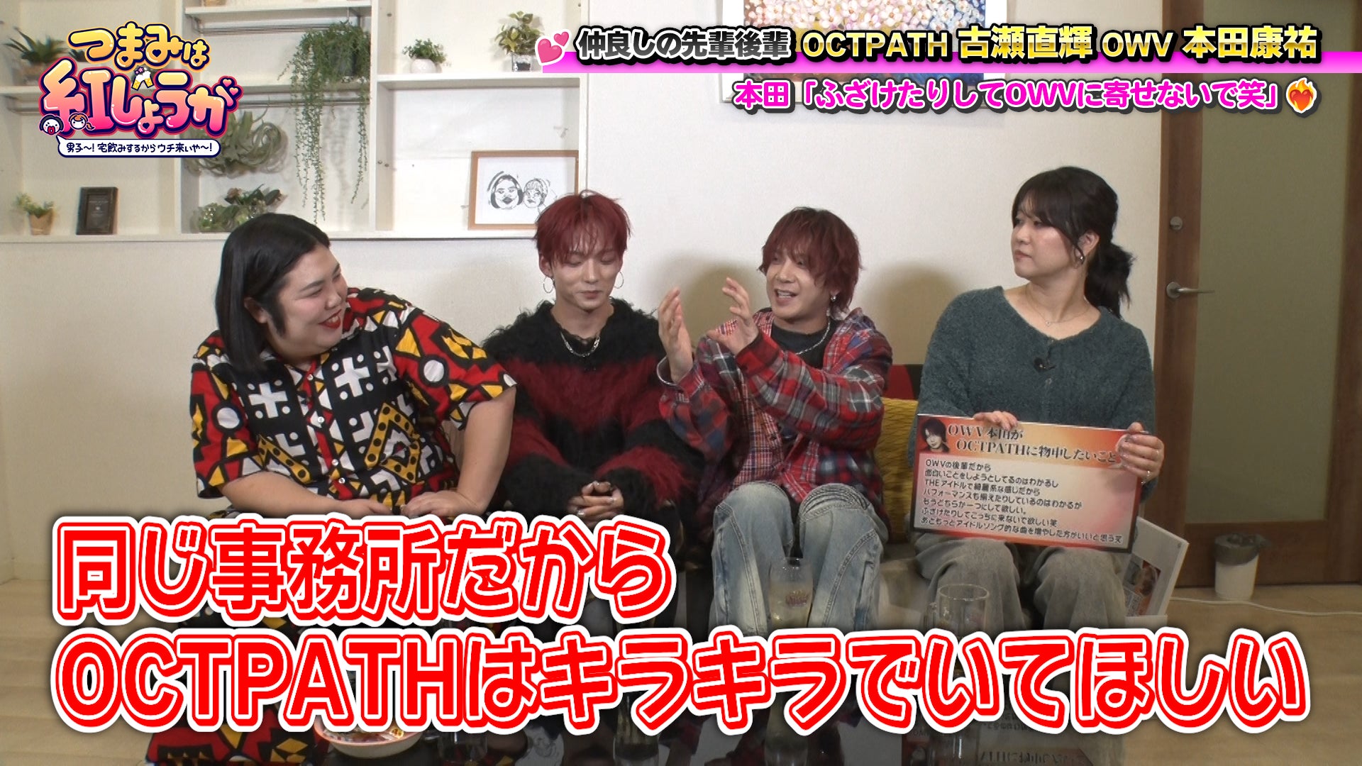 紅しょうがが、“宅飲み”スタイルでステキな男子ゲストと、食べて飲んでトークするBSよしもとの番組『つまみは紅しょうが 男子~!宅飲みするからウチ来ぃや~』(毎月第3・4土曜23:30~)。11月22日(土)の放送回では、前回から引き続き、2人でご飯に行くほど仲良しという先輩&後輩である、OWVの本田康祐&OCTPATHの古瀬直輝が登場します。