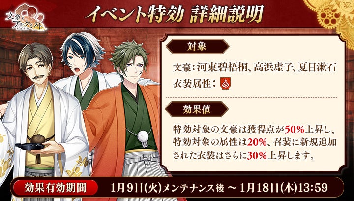 さらに、イベントと同時に開催される限定召装『年新た 俳句歳時記 季語集め』にて新規追加された「高浜虚子」「河東碧梧桐」「夏目漱石」の〈お正月衣装〉を編成すると、得点の獲得率がそれぞれ30%上昇します。
