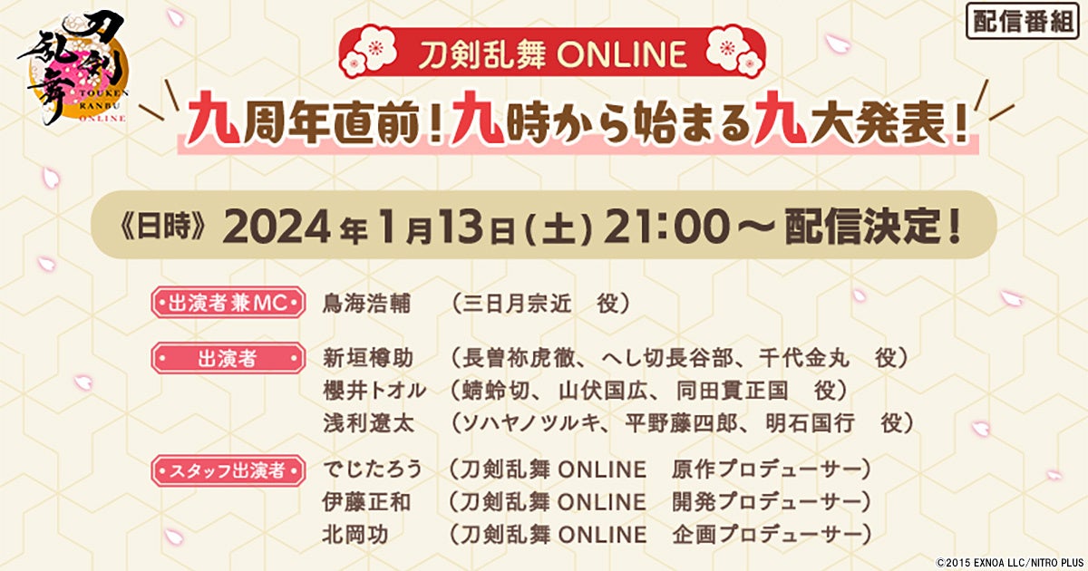 合同会社EXNOA(本社:東京都港区、CEO:村中 悠介、URL:https://games.dmm.com/)は、同社が開発・運営、株式会社ニトロプラスが世界観・シナリオ・キャラクターデザインを担当している、刀剣育成シミュレーション『刀剣乱舞ONLINE』にて、サービス開始九周年を記念した番組「刀剣乱舞ONLINE 九周年直前!九時から始まる 九大発表!」が2024年1月13日(土)に配信されます。