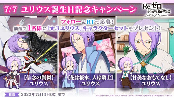 内容:『リゼロス』公式Twitter(https://twitter.com/re_zero_rezelos)をフォロー&キャンペーンツイートをRTすると、抽選で1名様に「「★3ユリウス」キャラクターセット」をプレゼントするキャンペーンを開催します。