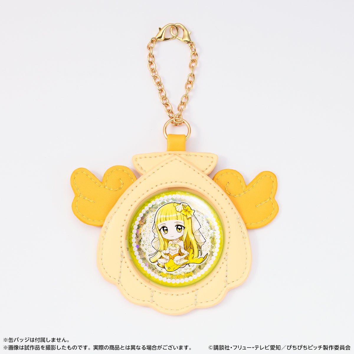 ココのアクアピッチをイメージしたイエローの缶バッジチャームは裏面にビニール加工が施されています。
