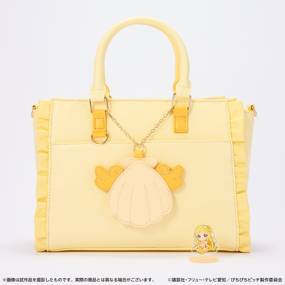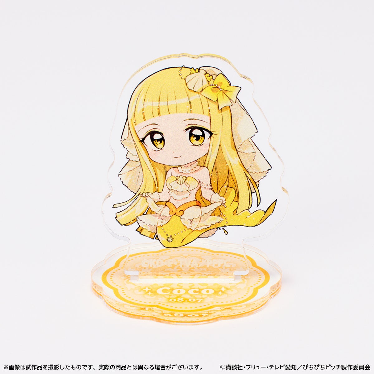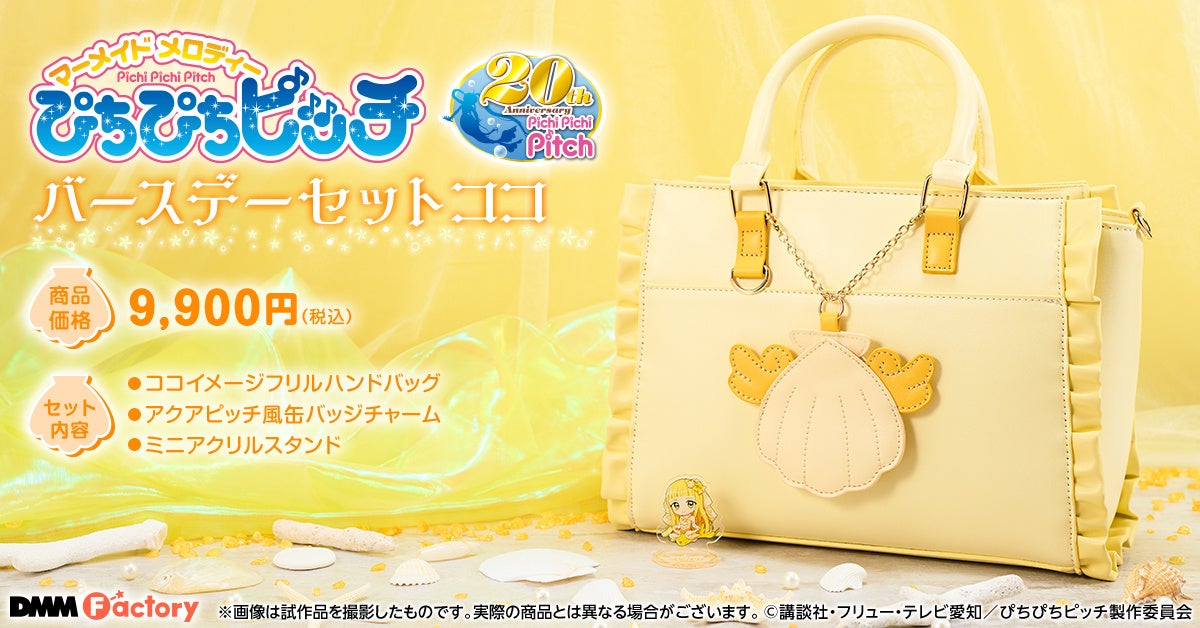 放送20周年を迎えたテレビアニメ『ぴちぴちピッチ』のマーメイドプリンセスたちを祝うバースデーセット第3弾は、「ココ」をイメージしたフリルハンドバッグ、アクアピッチをイメージした缶バッジチャーム、ミニキャライラストを使用したアクリルスタンドのセット。