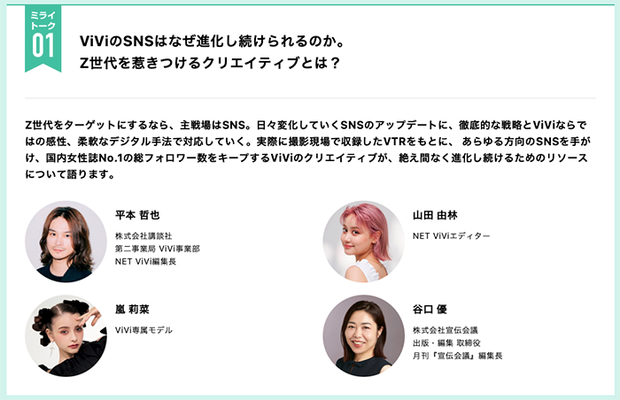 日々変化していくSNSのアップデートに、徹底的な戦略と「ViVi」ならではの感性、柔軟なデジタル手法で対応。実際に撮影現場で収録したVTRをもとに、 あらゆるSNSを手がけ、国内女性誌No.1の総フォロワー数をキープする「ViVi」のクリエイティビティが、絶え間なく進化し続けるためのリソースが紹介されます。