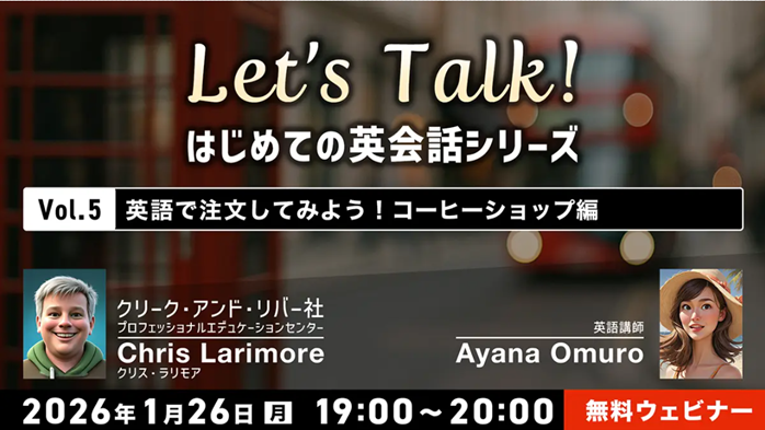 株式会社クリーク・アンド・リバー社(C&R社)は1月26日(月)、英語初心者の方を対象に、無料のオンラインセミナー「Let’s Talk! はじめての英会話シリーズ Vol.5英語で注文してみよう!コーヒーショップ編」を開催します。