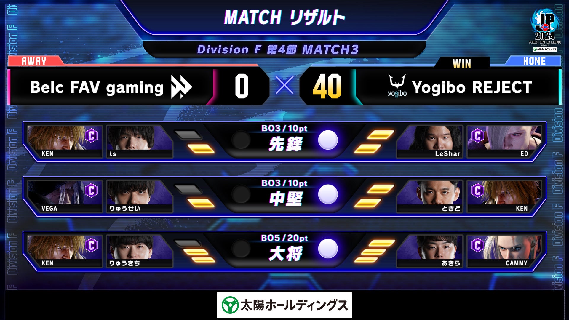 全ての試合がフルセットまでもつれた接戦を制し、「Yogibo REJECT」が40ポイントを獲得し完勝。「あきら選手」の初勝利もあり、チームの勢いも更なる加速が期待される。