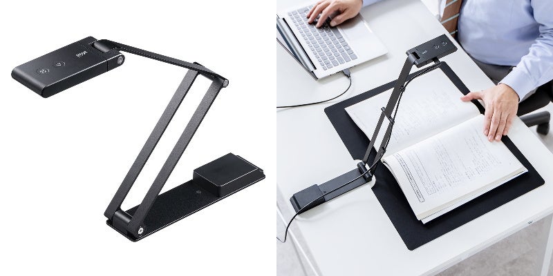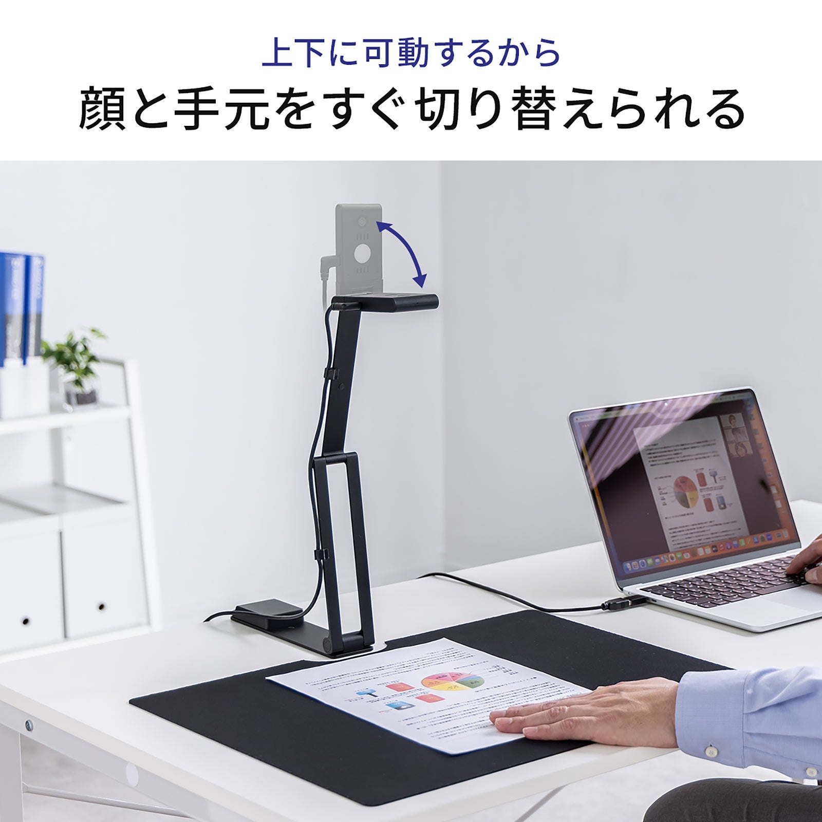 関節が自由に可動するので書画カメラとして書類を写したり、WEBカメラとして顔を写したり切替えが簡単にできるので、WEB商談や会議などに便利です。