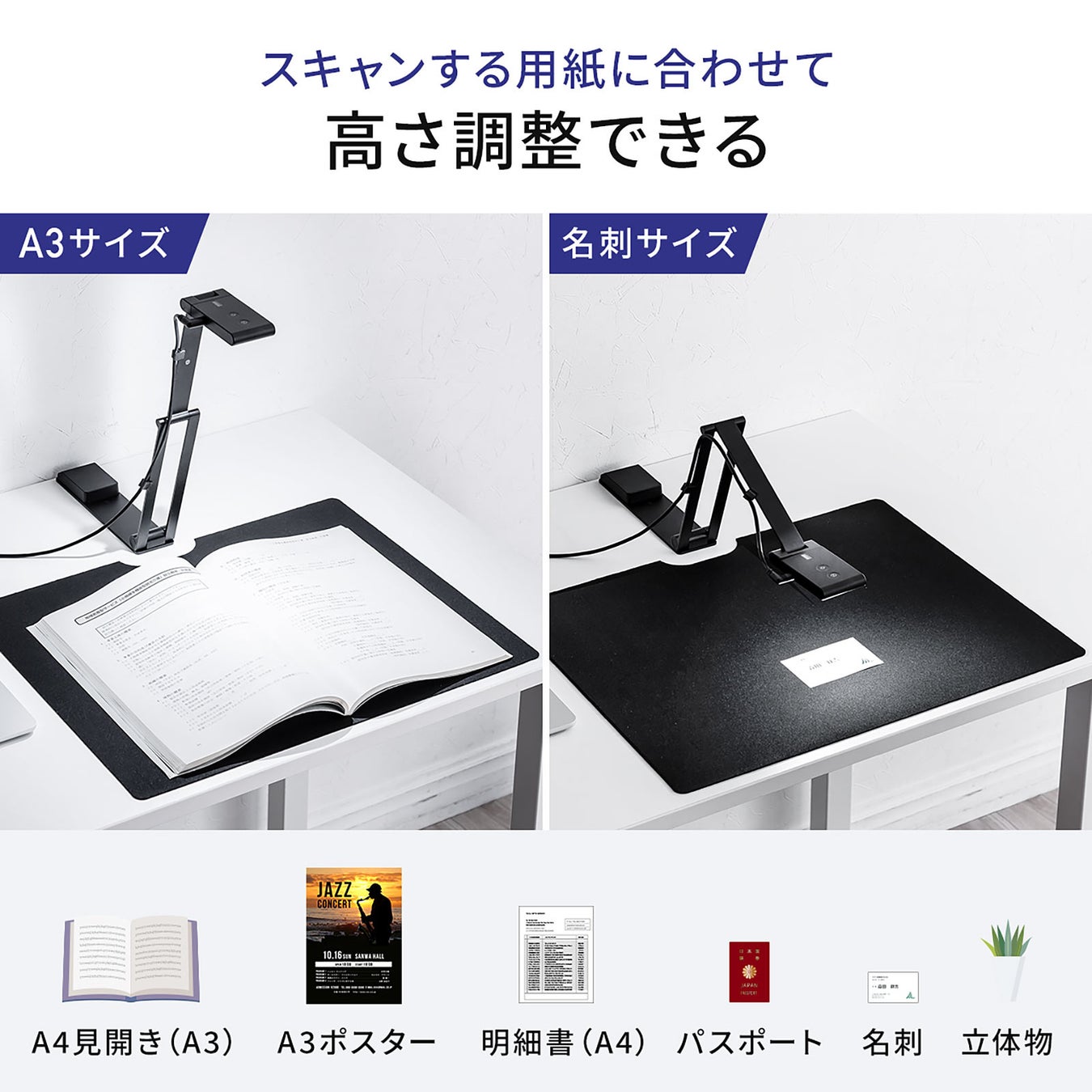 カメラの位置が自由に動かせるので、名刺から最大A3サイズまで幅広く対応します。