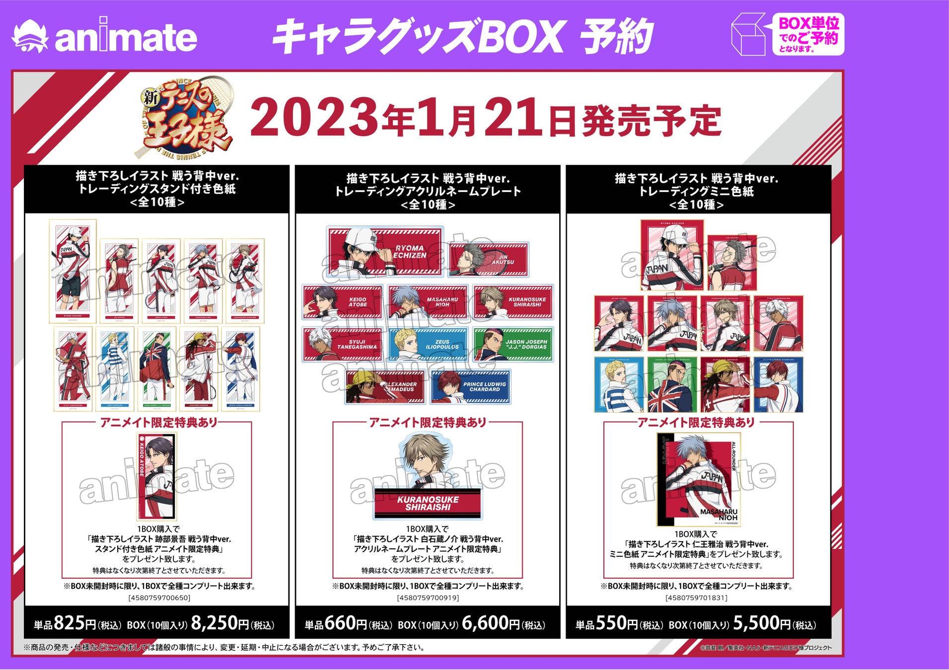 2023年1月21日(土)~2023年2月5日(日)のイベント開催期間中、全国アニメイト/アニメイト通販にてTVアニメ『新テニスの王子様』関連のキャラクターグッズをご購入、ご予約内金1,100円(税込)毎にフェア限定購入特典「チェキ風イラストカード(全10種)」を1枚プレゼント!