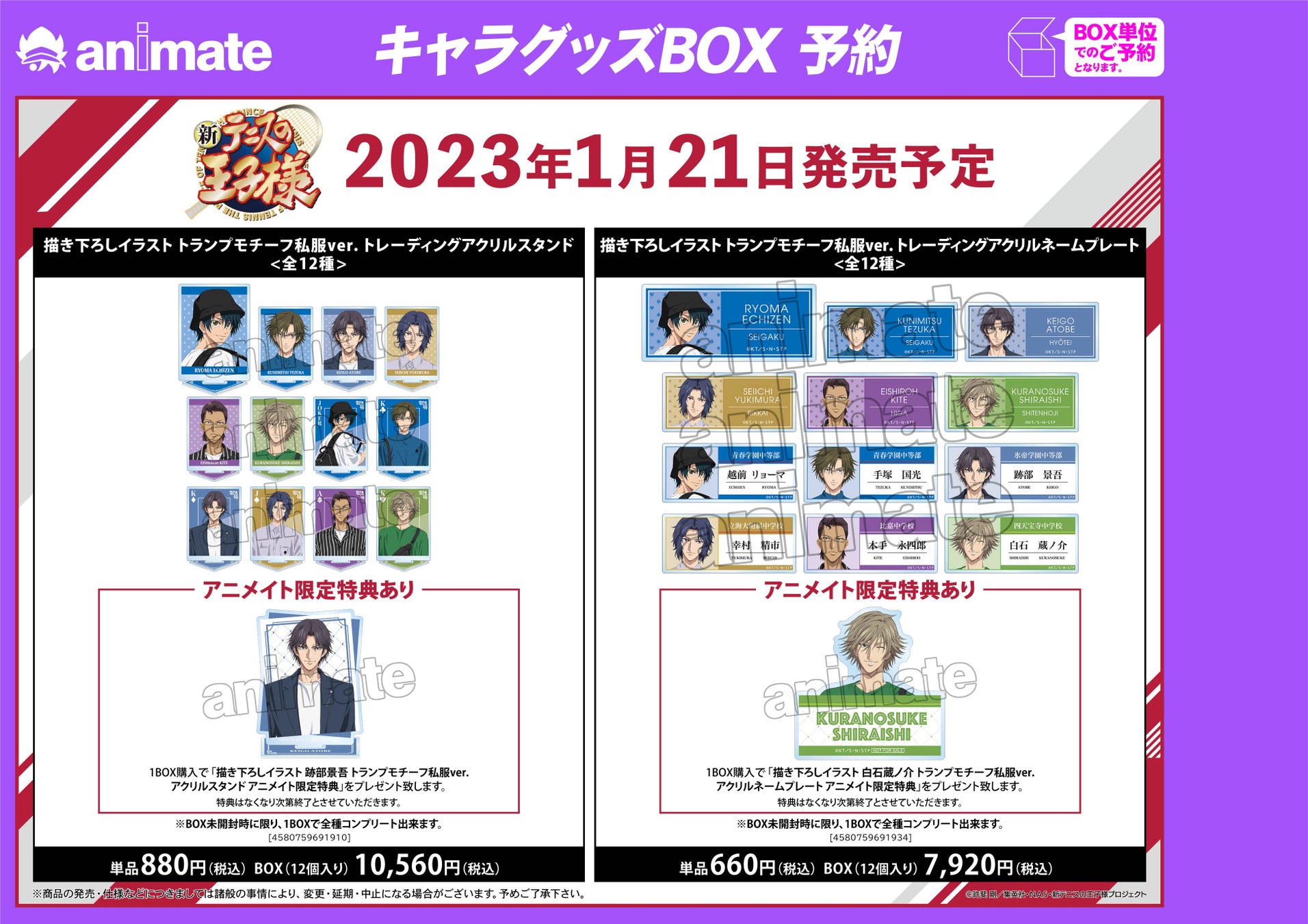 ※1月21日(土)より予約開始予定のECサイト「AMNIBUS」では、BOX購入特典として「描き下ろしイラスト 越前リョーマ トランプモチーフ私服ver. アクリルネームプレート AMNIBUS限定特典」を予定しております。
