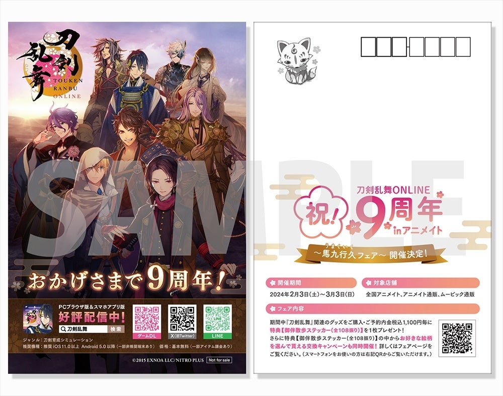 『刀剣乱舞ONLINE』は、2015年1月14日(水)にPCブラウザ版のサービスを開始して以来、たくさんの皆様に支えられ、2024年1月14日(日)に九周年を迎えることができました。2024年1月14日(日)時点で、ゲーム内に実装されている「刀剣男士(とうけんだんし)」は計109振りとなり、累計ユーザー数は1,200万を突破しております。