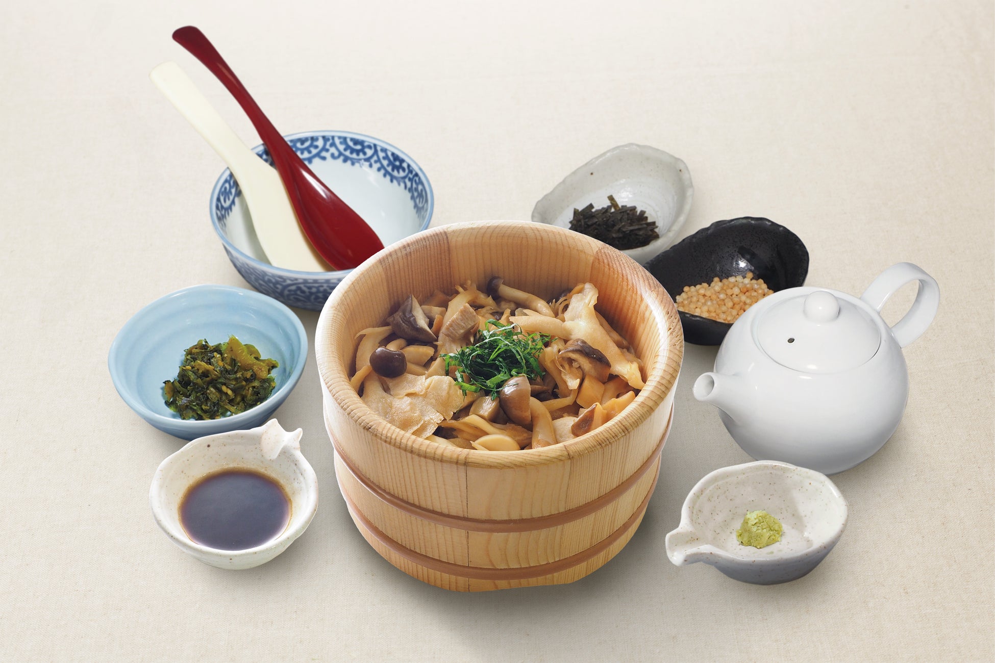 当社は、お客さまより毎年ご好評いただいている、『雪国まいたけ』様とのコラボメニューを今年も9月18日(水)より秋季限定で販売いたします。今回の限定商品「きのこのおひつごはん」は、「雪国えりんぎ」「雪国まいたけ白」「雪国ぶなしめじ」の3種のきのこを使用し、きのこの旨味や食感、風味を引き立てるバター醤油でアレンジしております。また『おひつごはん四六時中』のこだわりの“特製だし”とも調和するよう仕立てており、締めのだし茶漬けとしてもお愉しみいただけます。旬のきのこの旨味がたっぶり味わえる秋の味覚にぴったりの一品となっております。
