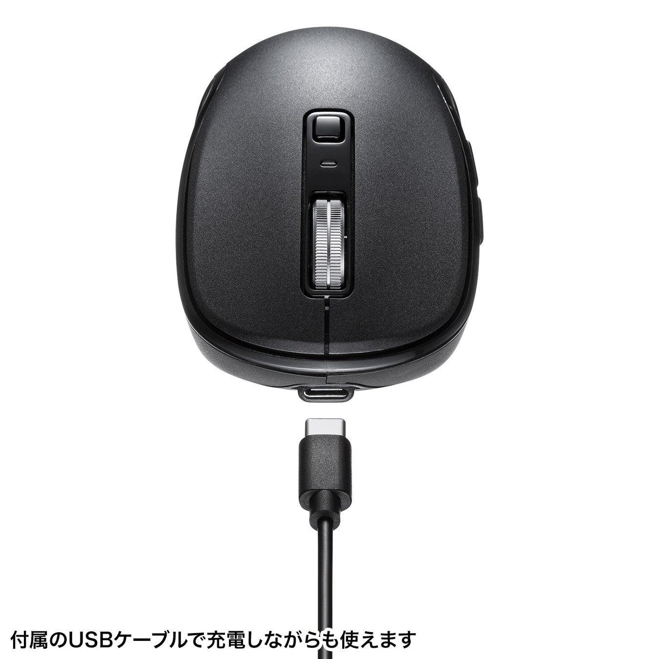 付属のUSB Type-Cケーブルで充電し、繰り返し使えるワイヤレスマウスです。乾電池の重みがない分軽量で、長時間のマウス操作でも手が疲れにくく、快適に操作できます。また、充電ケーブルを挿したままでも使用できるので、急な電池切れにもすぐに対応することができます。