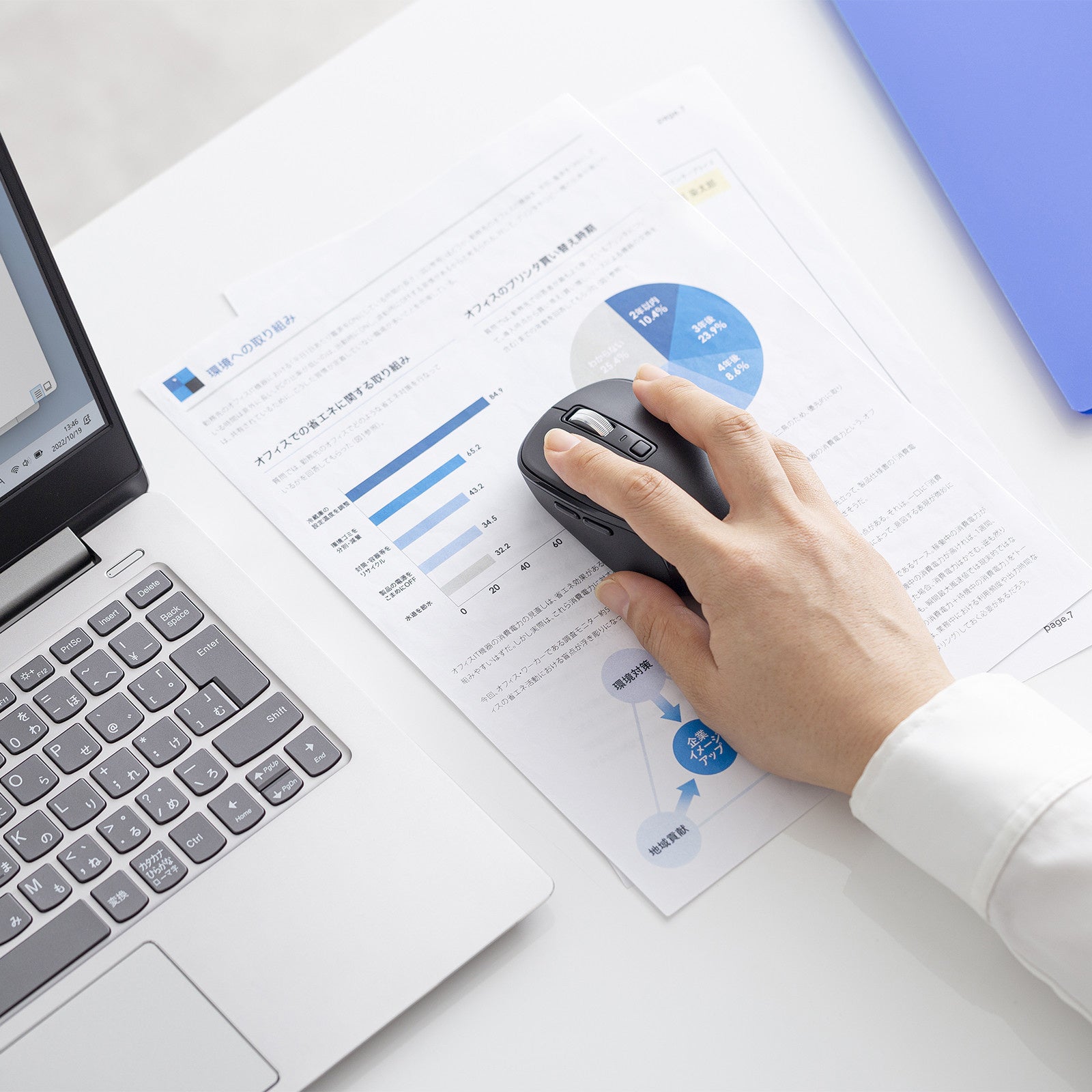 本シリーズは、繰り返し使える充電式+静かなクリック⾳でモバイルワークに最適な、静音ワイヤレスマウスです。